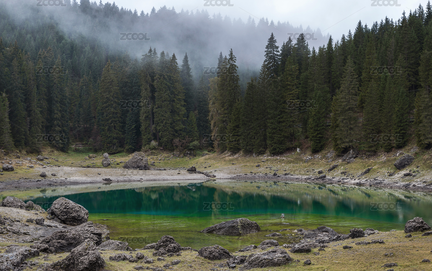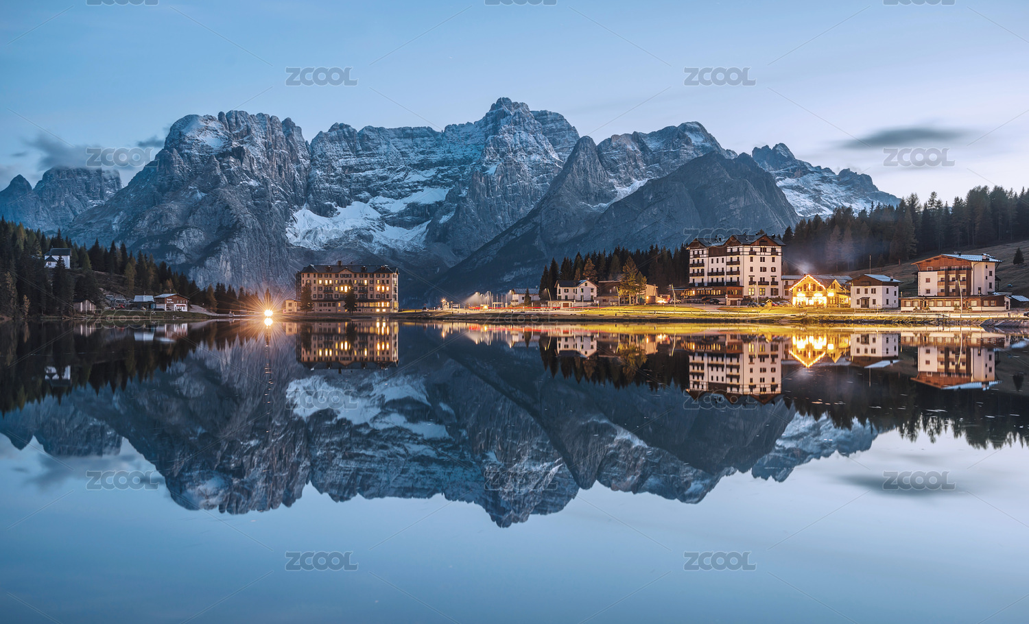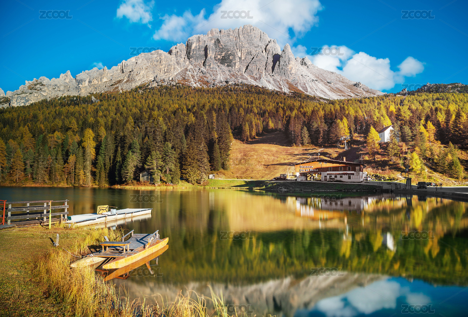 歐洲意大利多洛米蒂山區(qū)無人風(fēng)景湖邊倒影