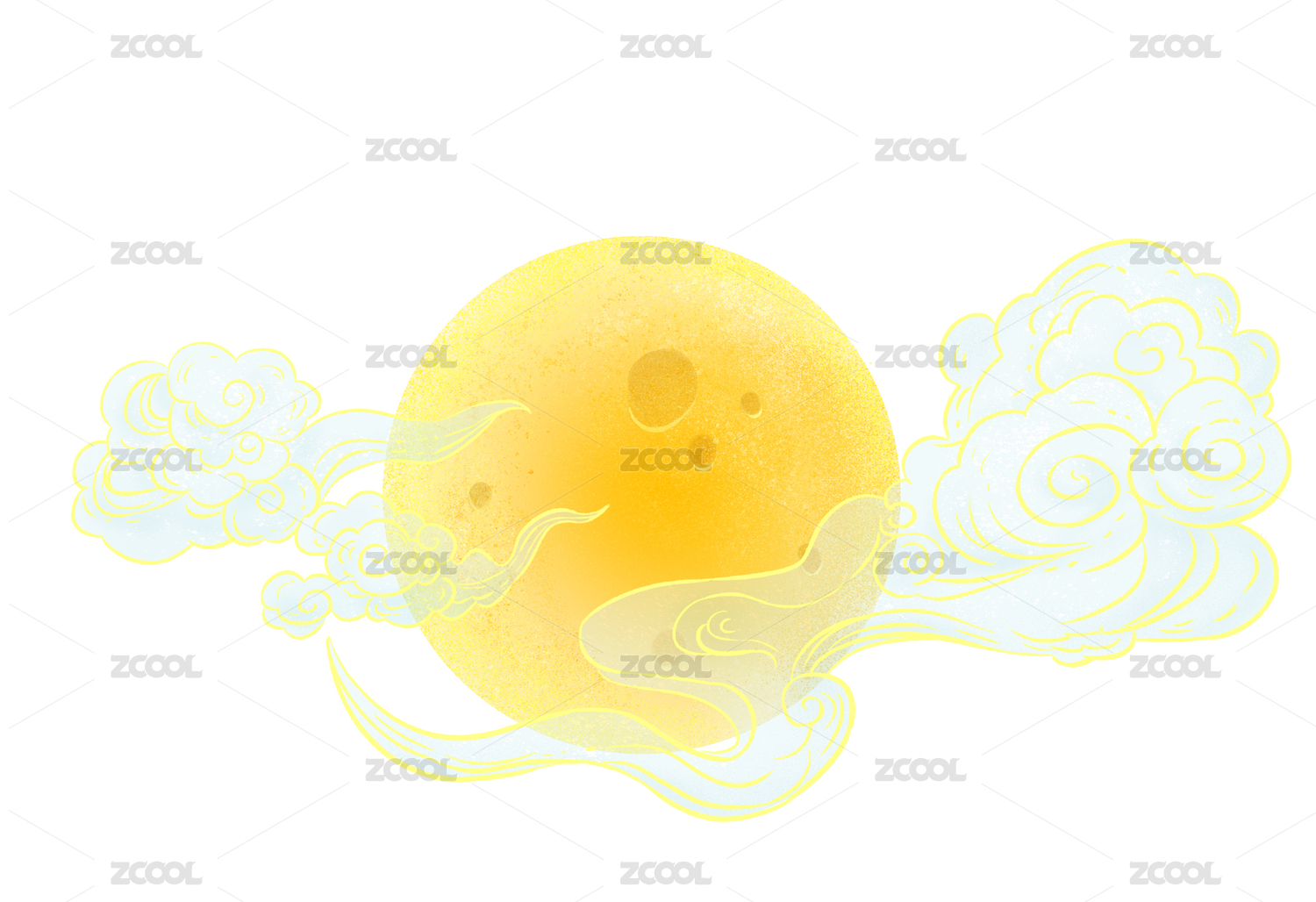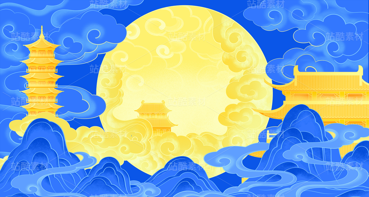 中秋節(jié)金月祥云宮殿山流云月亮國潮插畫