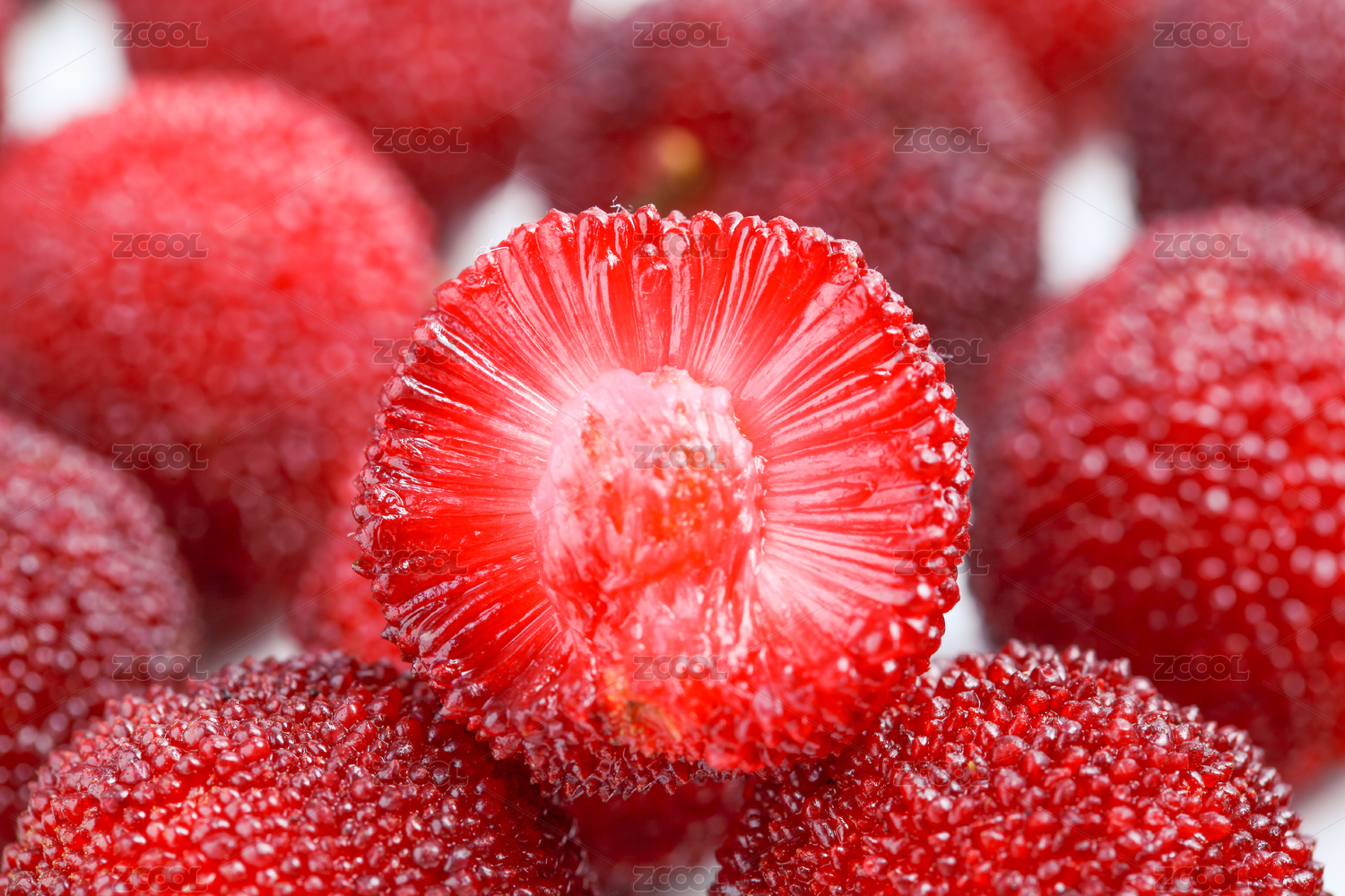 白色背景上擺放的成熟的紅色楊梅剖面特寫