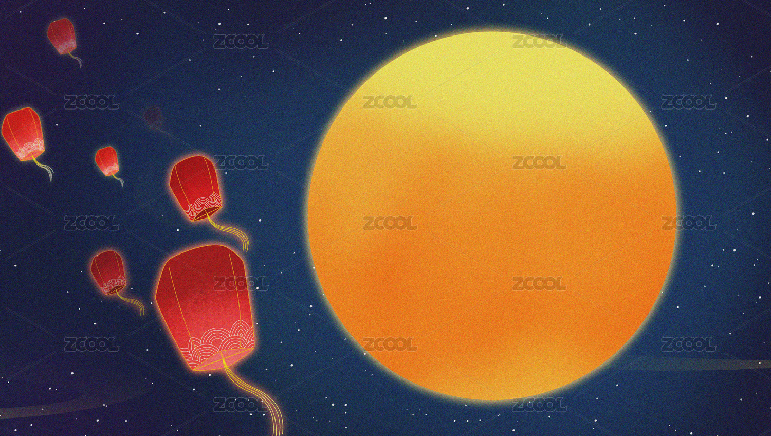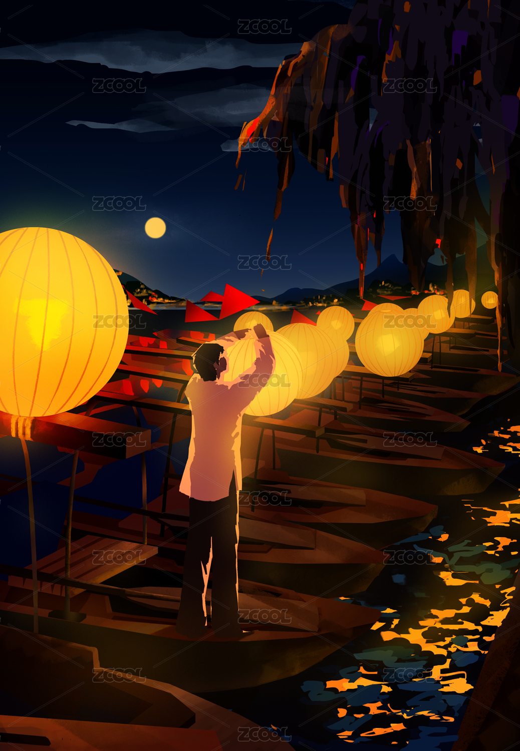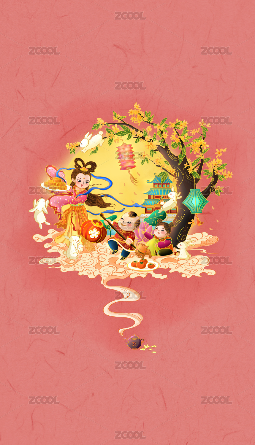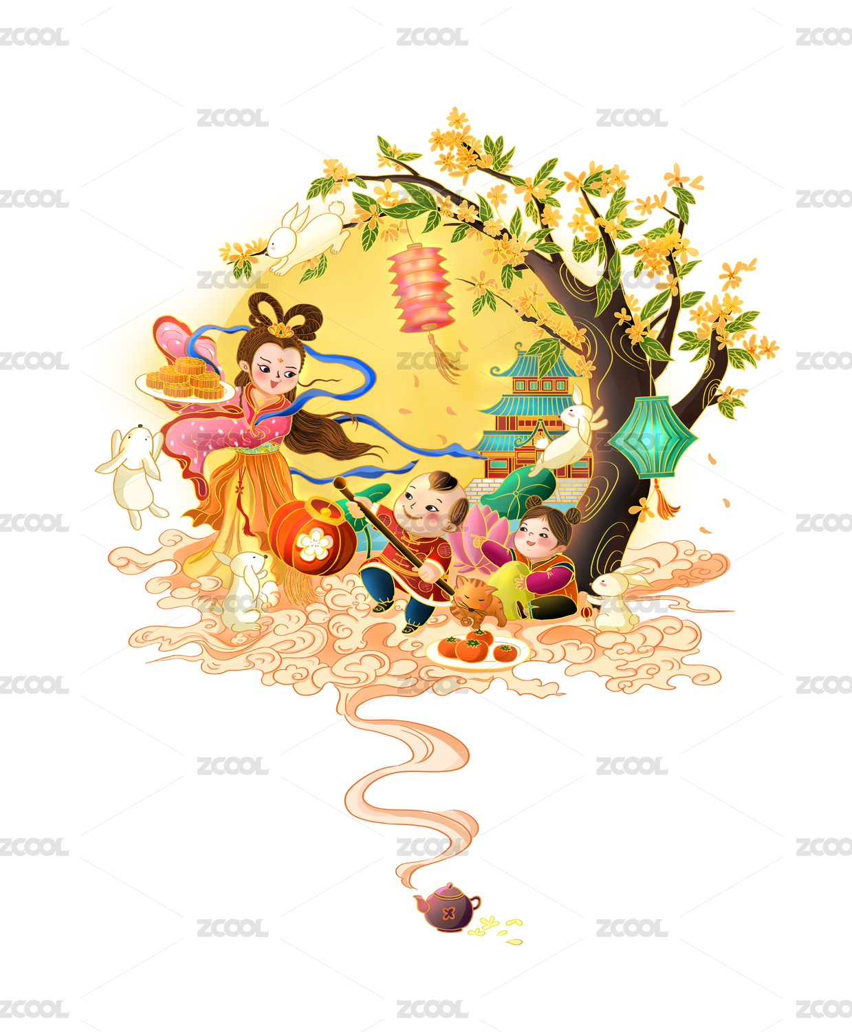 中國(guó)風(fēng)中秋嫦娥男孩女孩在月亮燈籠下慶祝