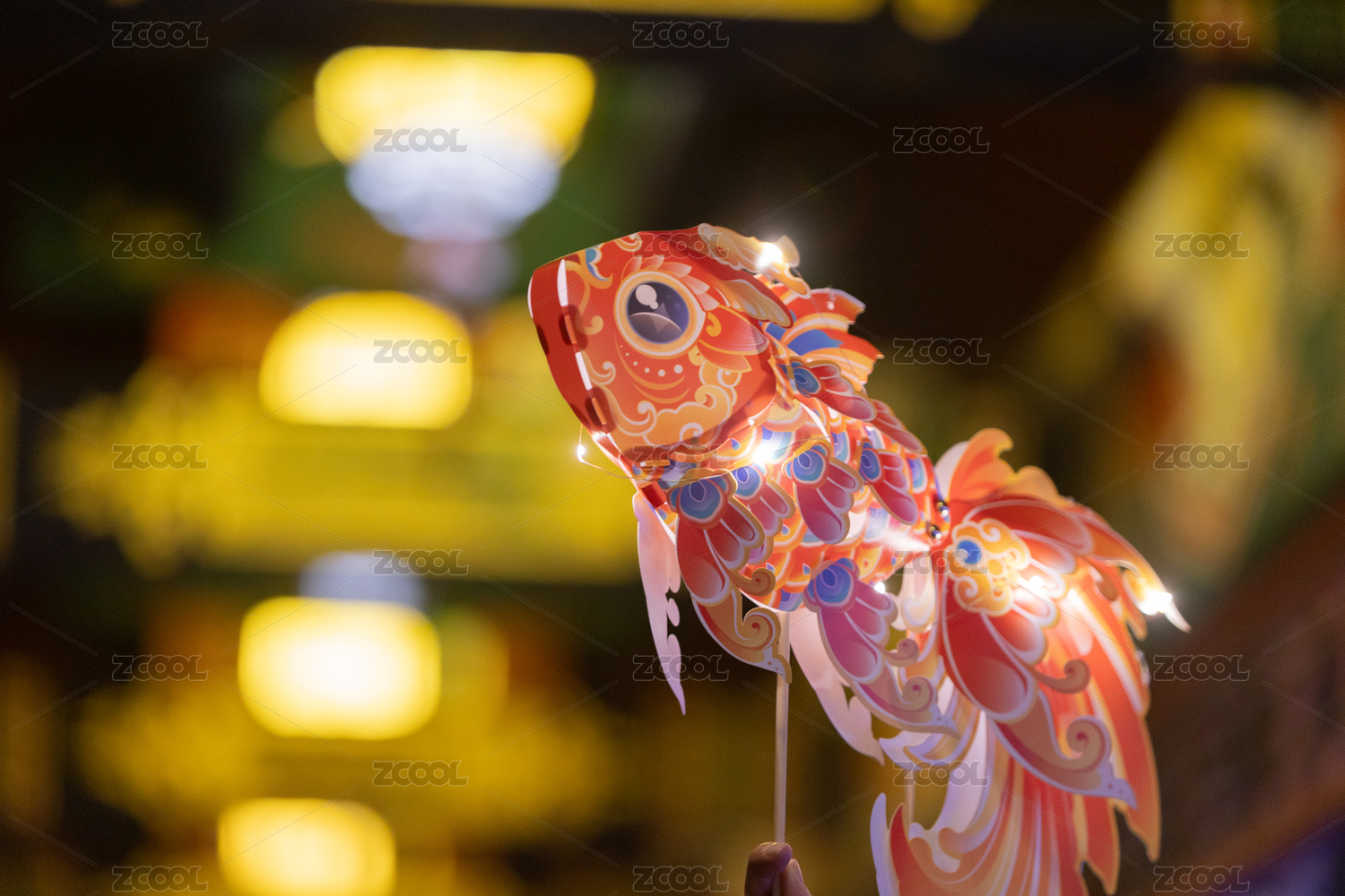 晚上媽媽與小男孩在琉璃瓦牌樓處玩月亮燈球