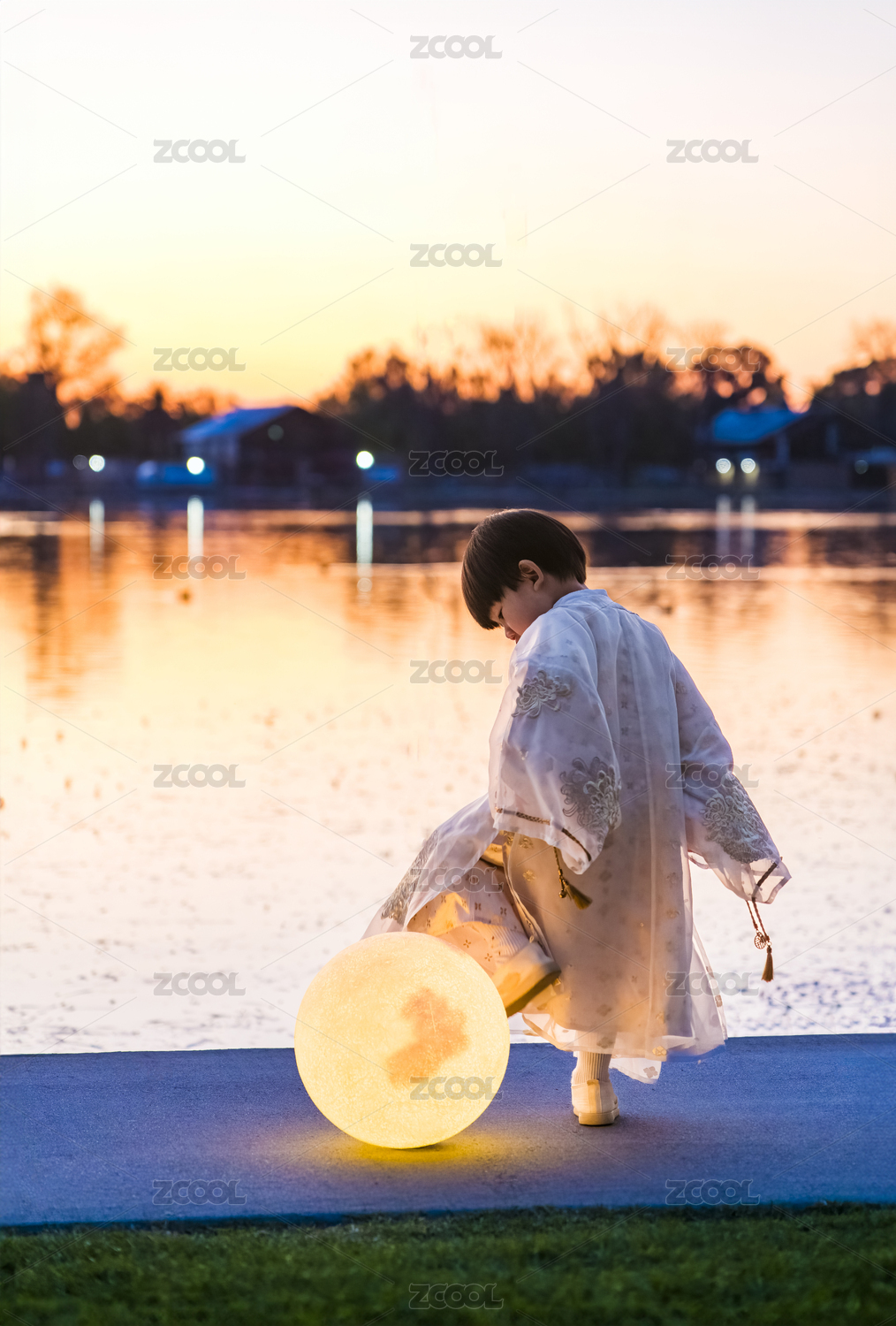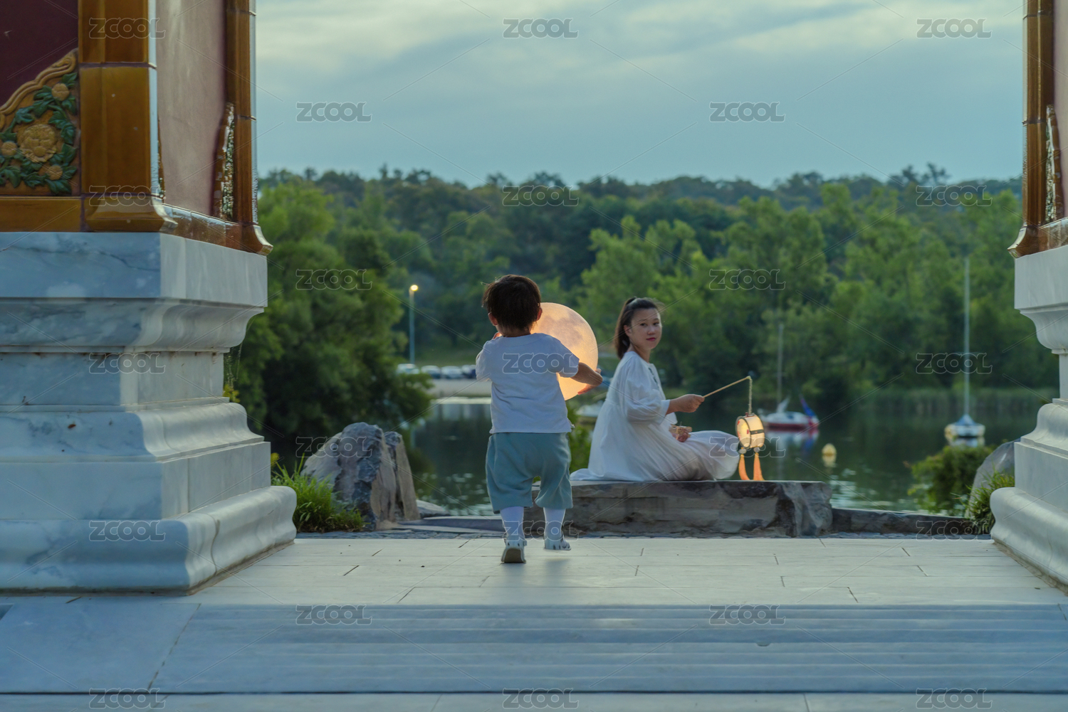 小男孩在琉璃瓦牌樓處云媽媽一起玩月亮燈