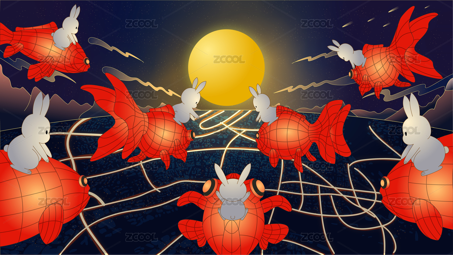 一群騎著金魚(yú)燈飛向月亮的兔子