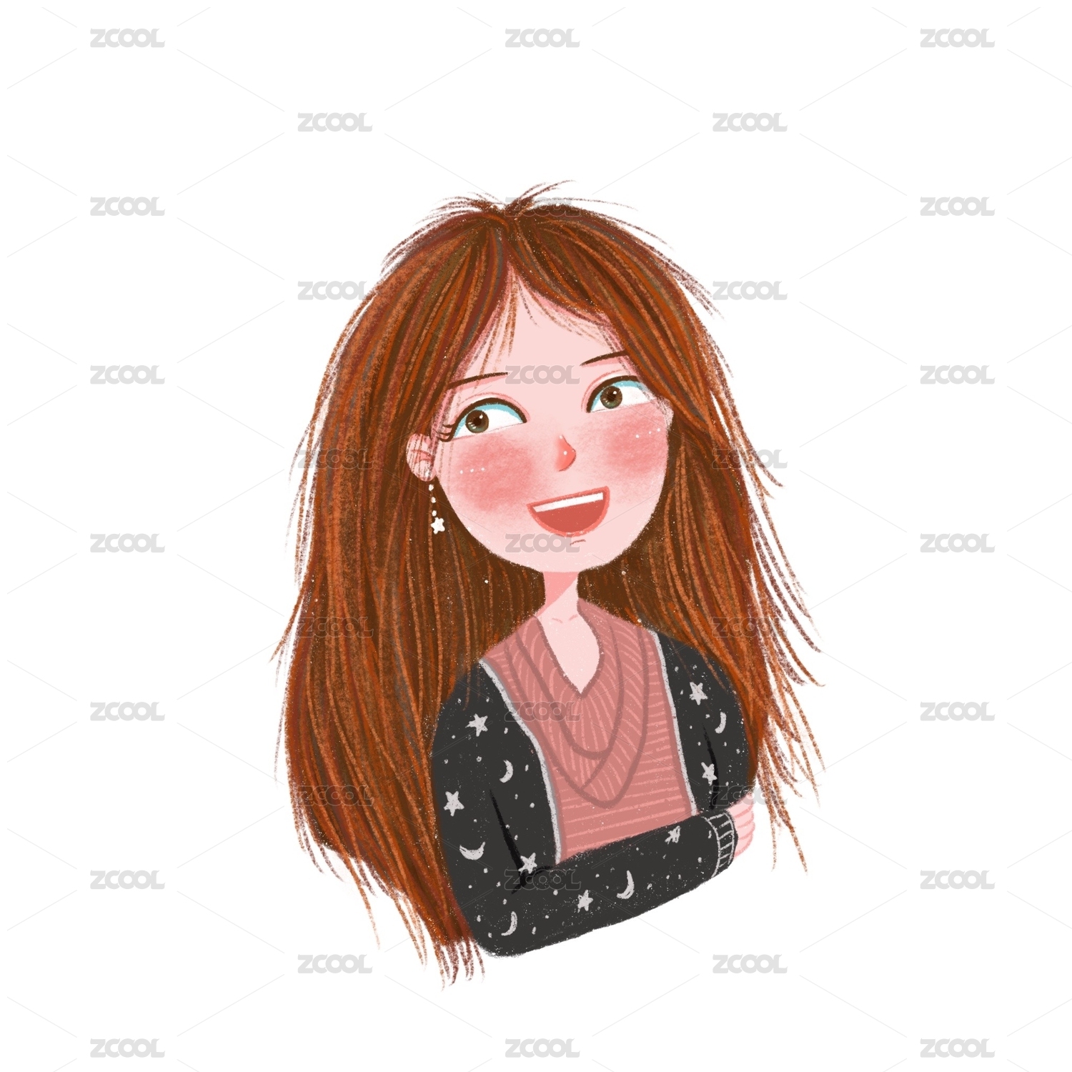 原創(chuàng)手繪插畫開心的長發(fā)女孩