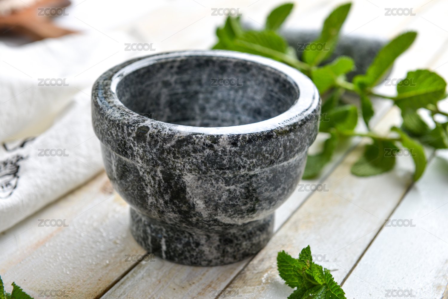 白色木板上香草和石頭研磨器