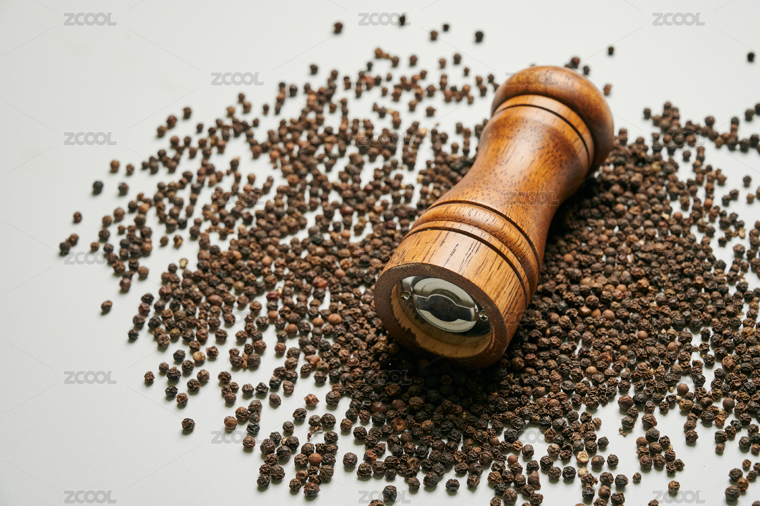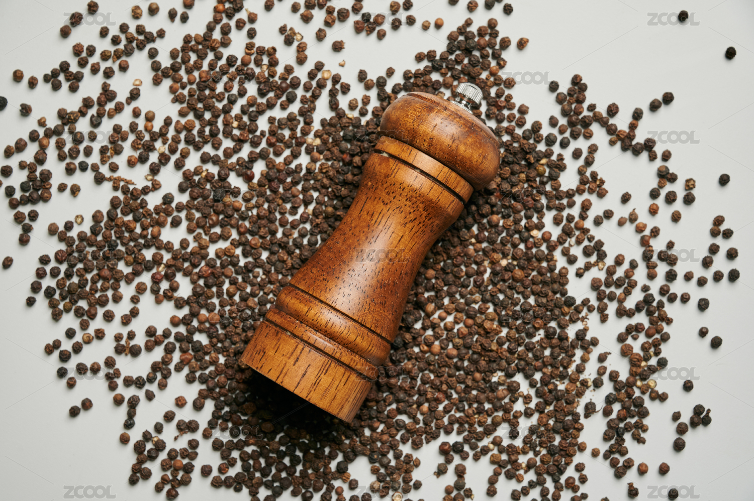 白底上一個(gè)木制胡椒調(diào)料研磨器