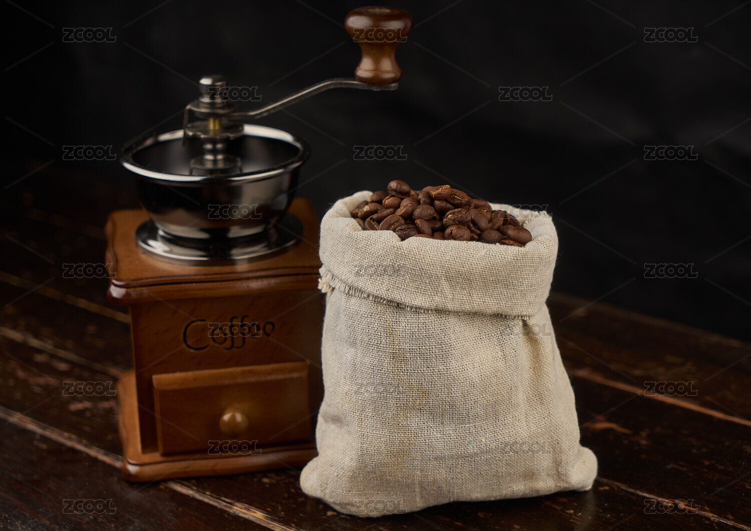 裝在白色麻布袋里的咖啡豆和老式手動(dòng)研磨器