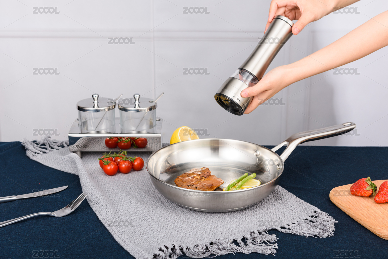手持研磨器正在給煎鍋里的豬排撒胡椒粉末