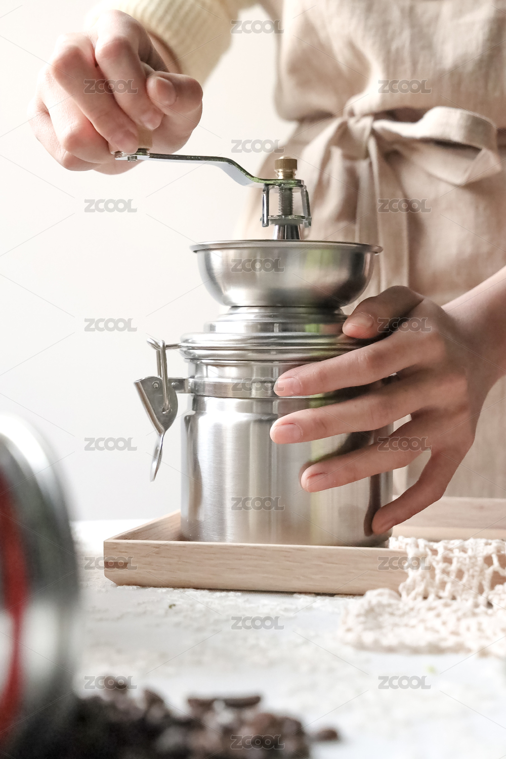 研磨器中咖啡粉和散落的咖啡豆