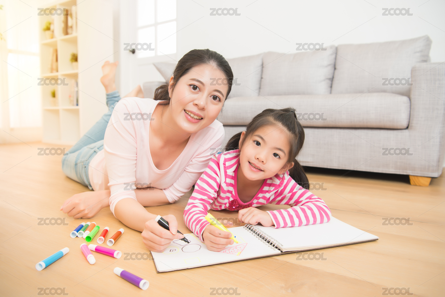 亞洲快樂的小女孩繪畫與她的母親躺在木地板的客廳家居繪制素描畫。家庭活動的概念。