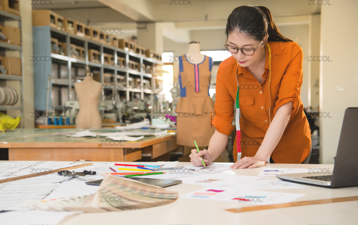 美麗的混血亞洲中國女設計師繪制草圖的新一季設計制造辦公室工作室。職業(yè)和職務侵占的概念。