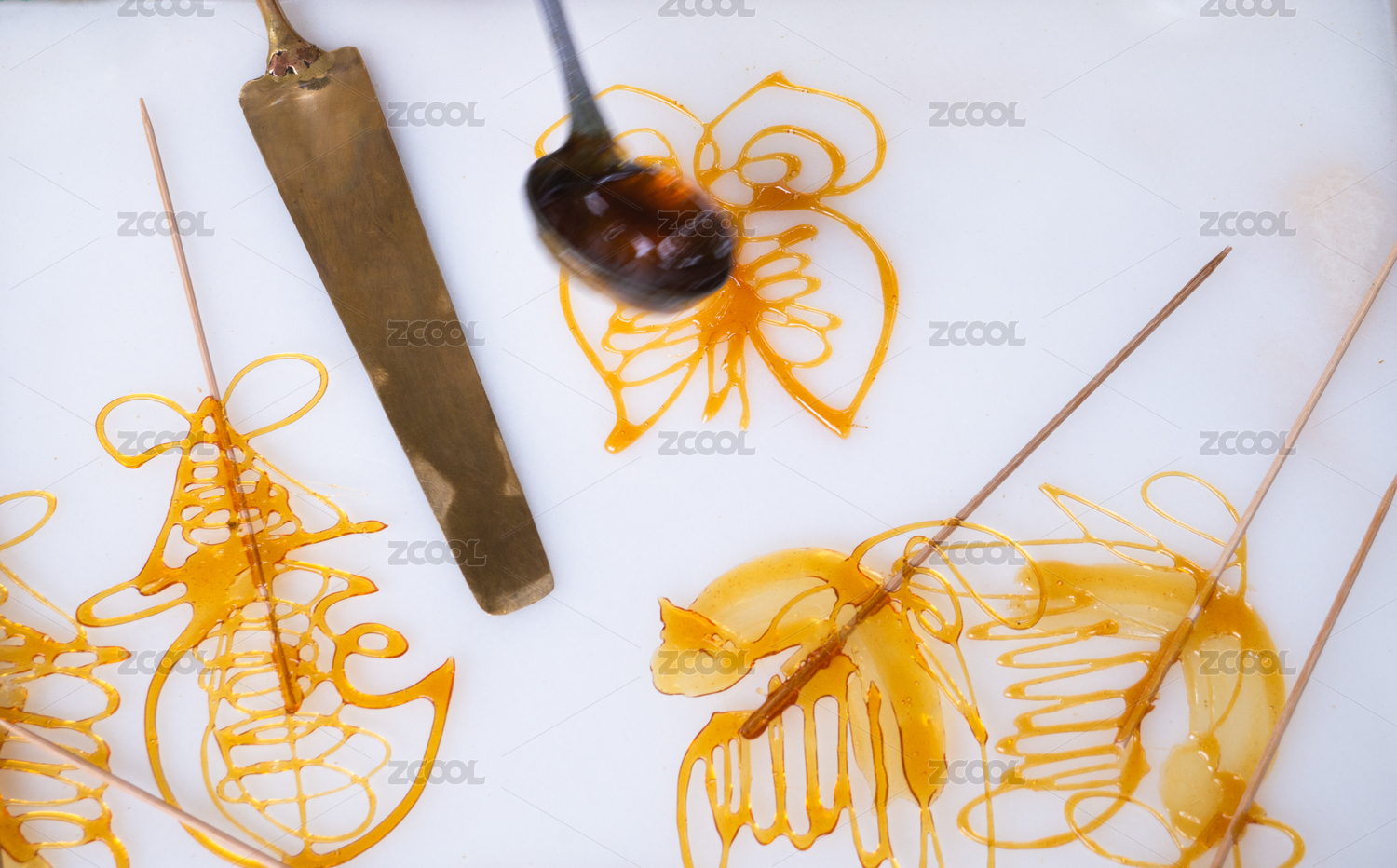 正在白色漢白玉石板上用鐵勺乘黃色糖汁繪制的中國民間傳統(tǒng)糖畫