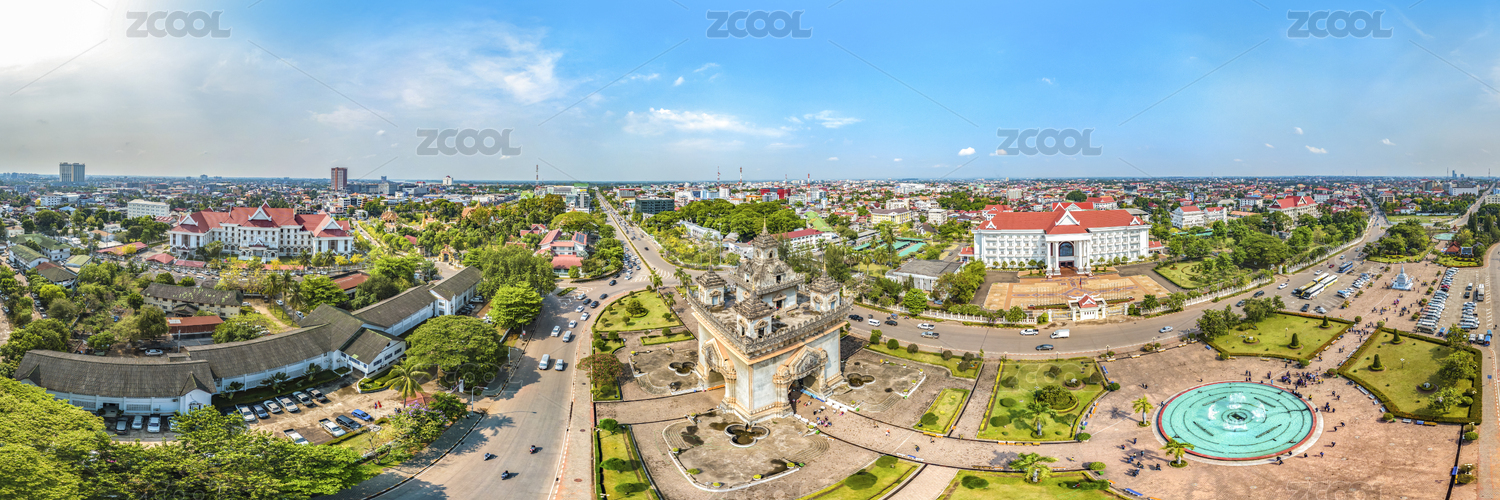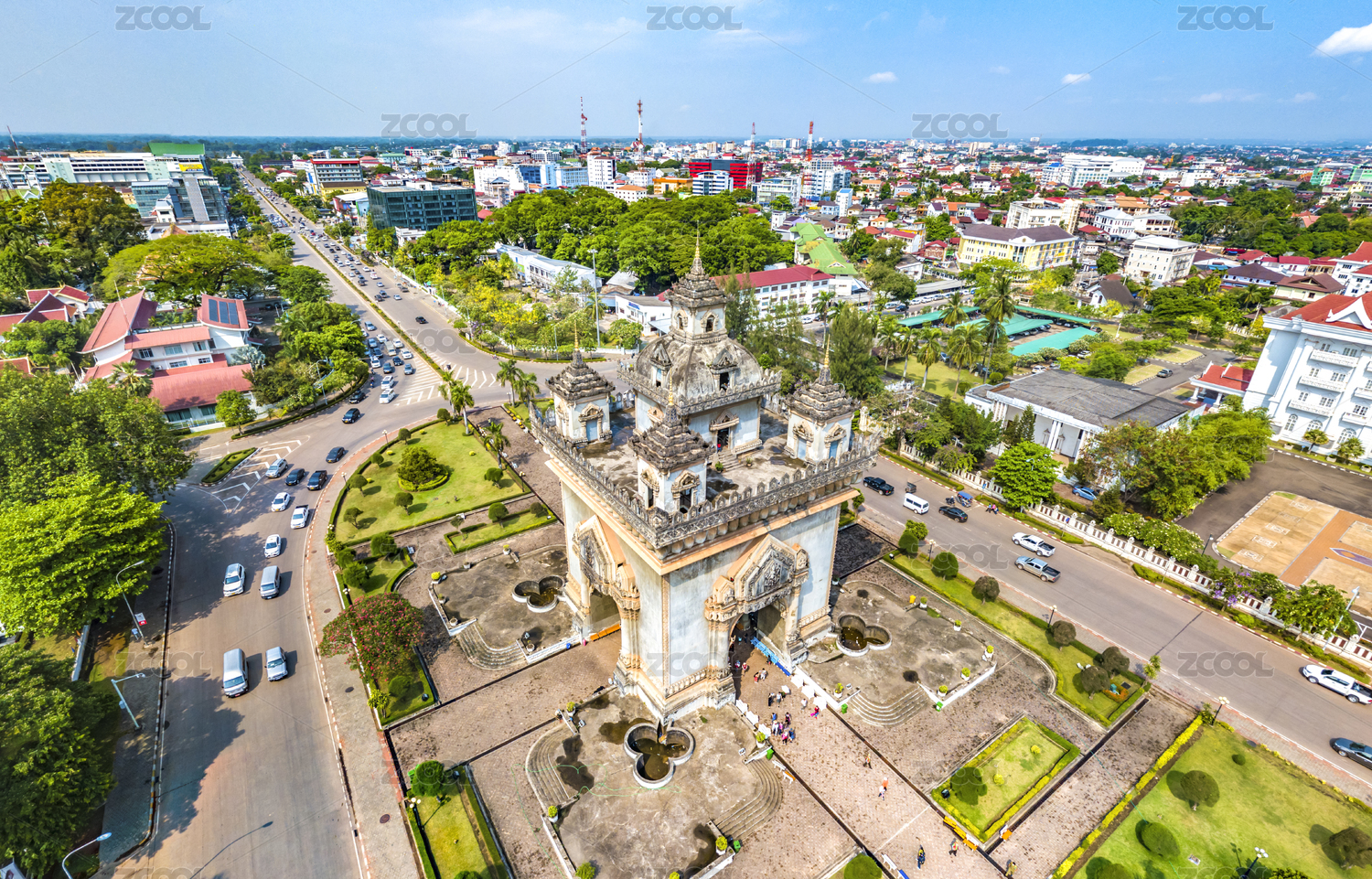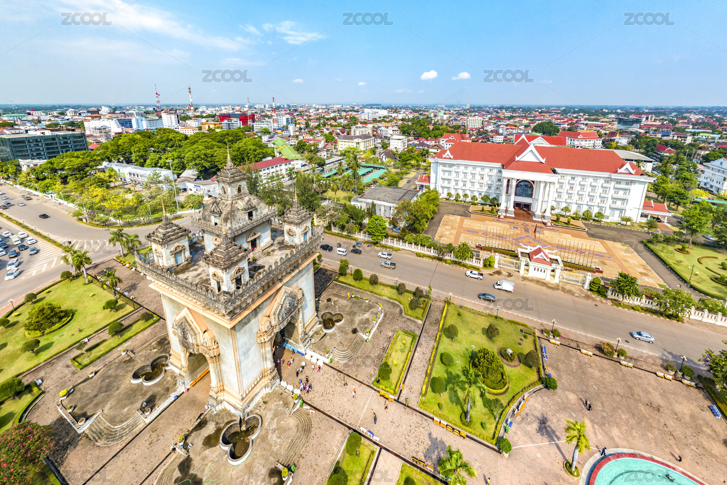 Panorama of Patuxai (Victory Gate) and Downtown Cityscape of Vientiane, Laos, Southeast Asia. Aerial View.