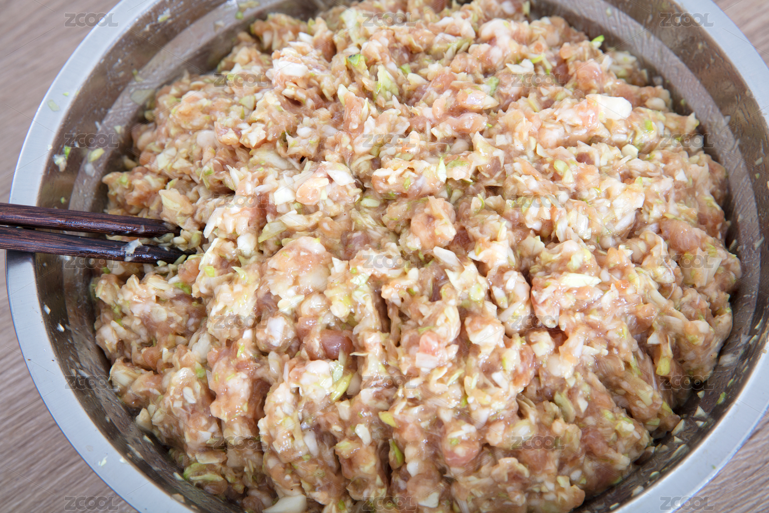 俯視拍攝盆子里的豬肉大蔥餃子陷背景