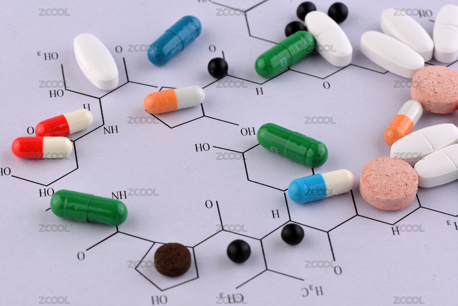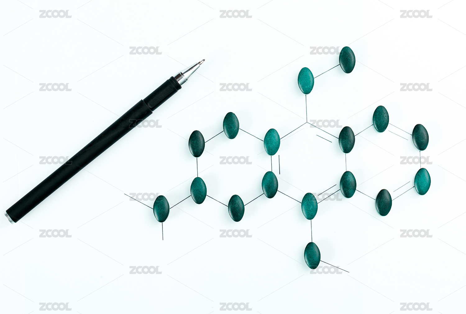 藥片排列成化學(xué)分子式結(jié)構(gòu)和一紙筆