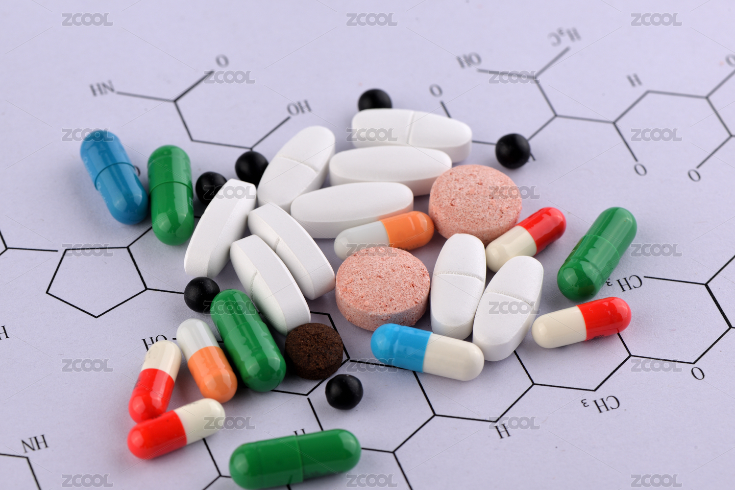 藥片排列成化學(xué)分子式結(jié)構(gòu)和散落的藥片