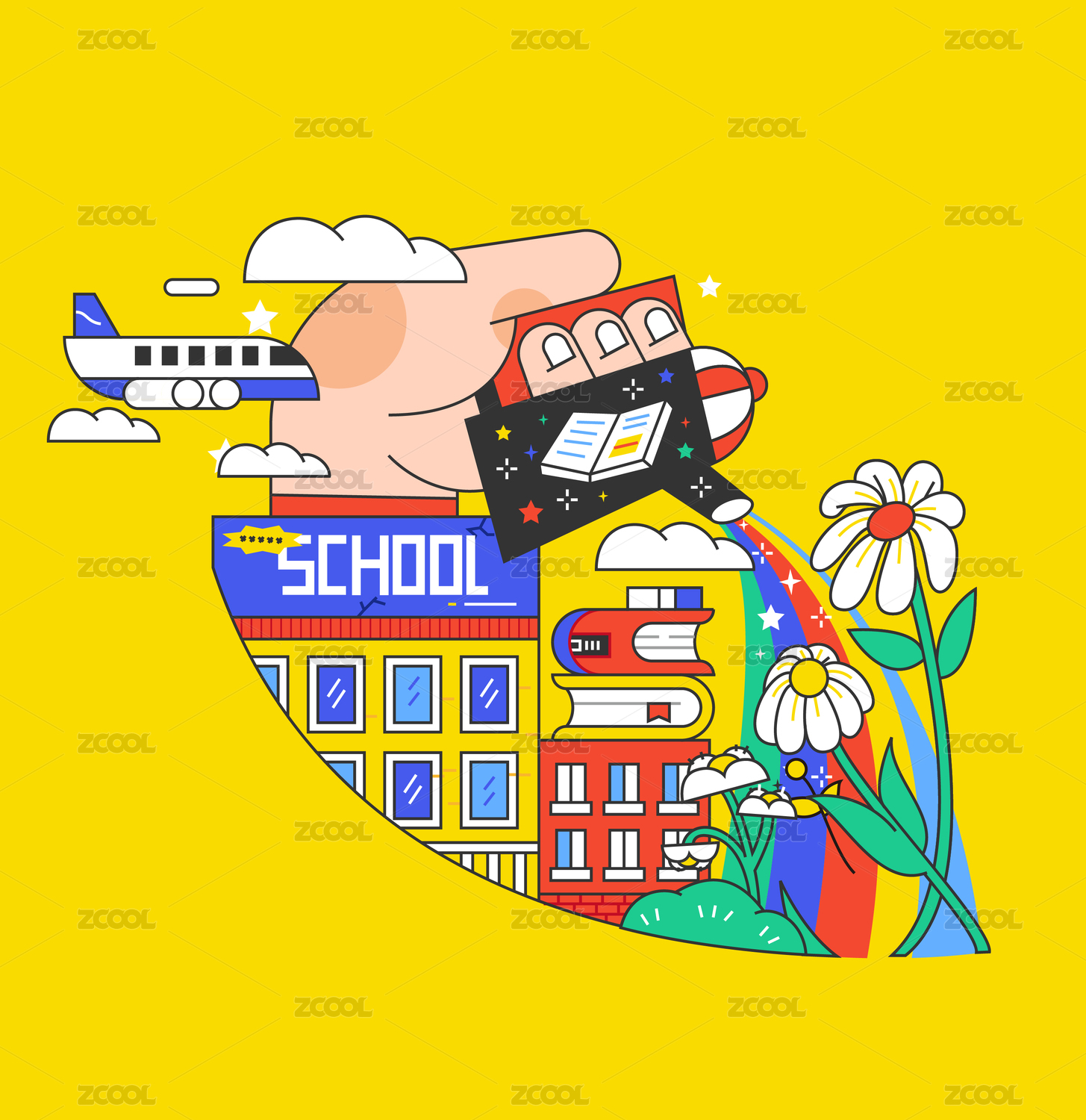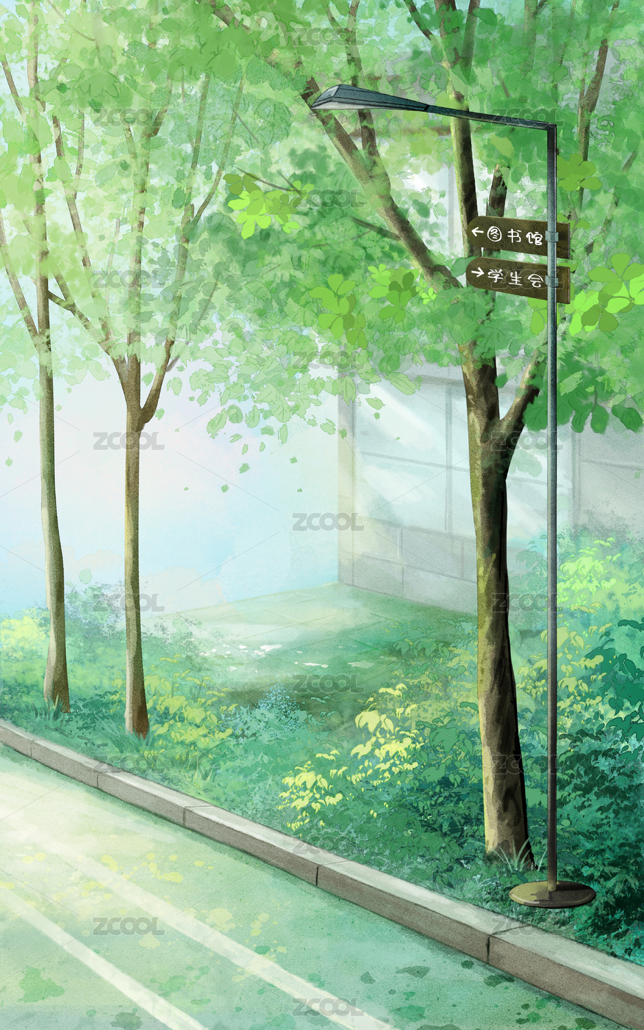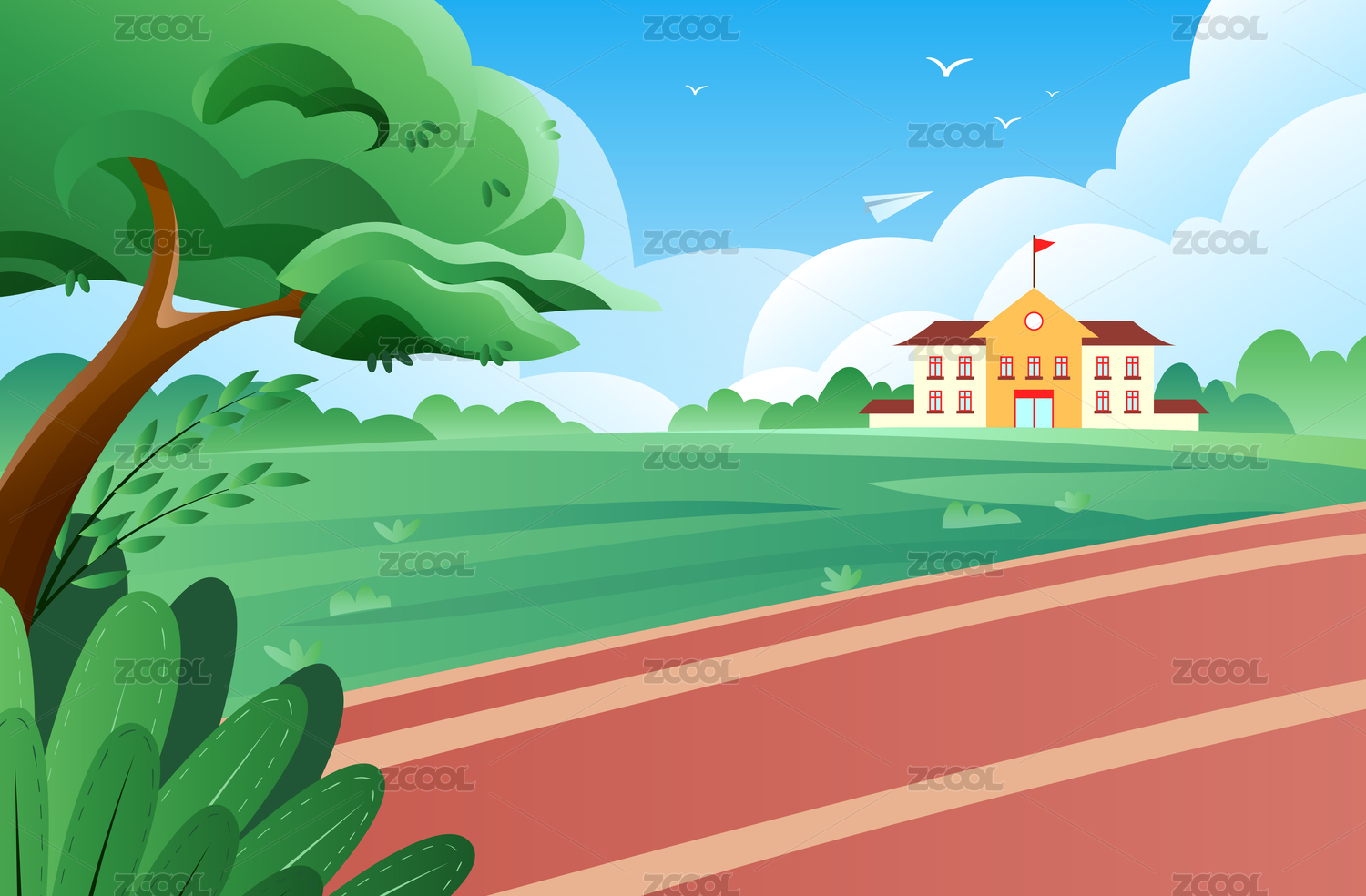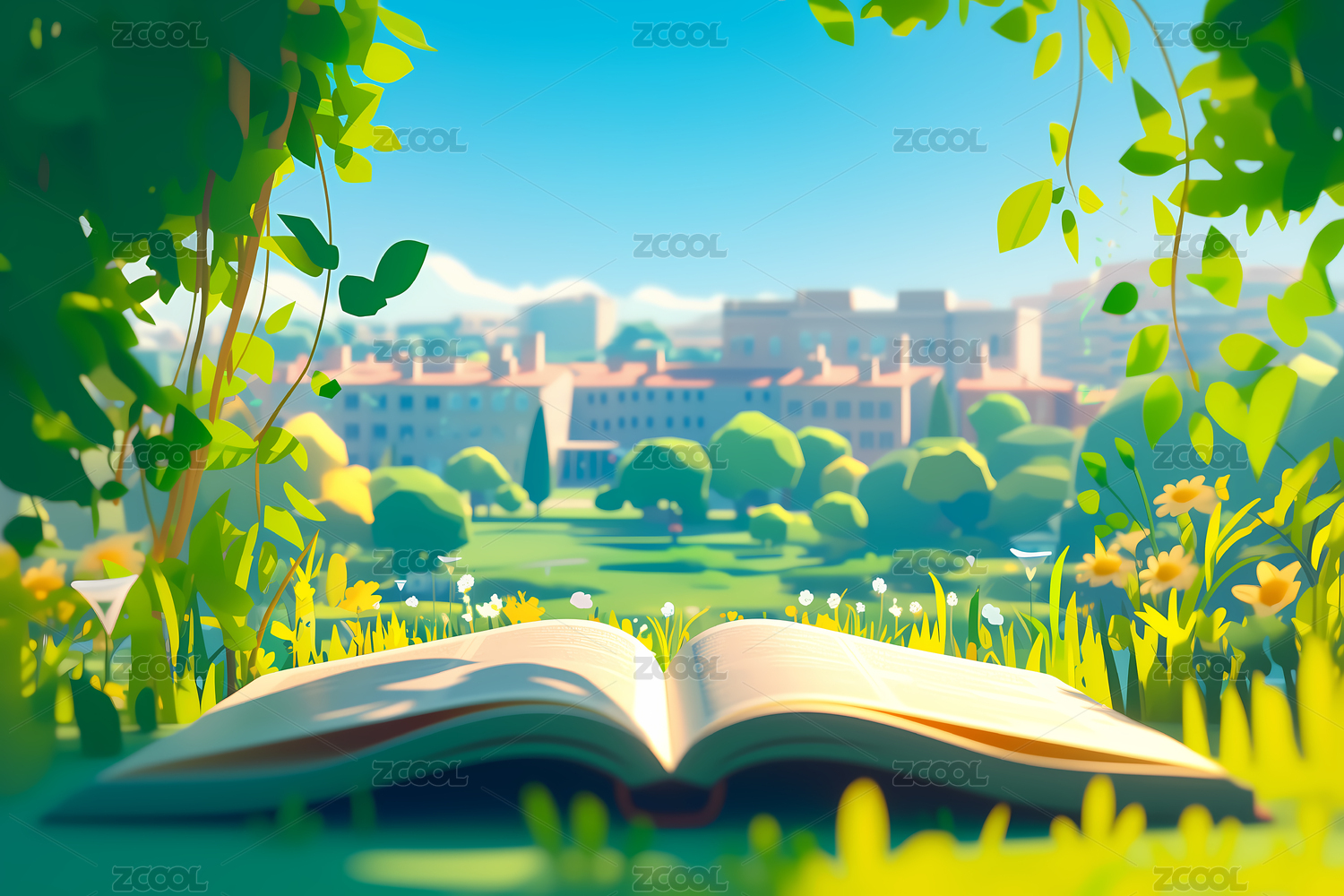 草地上翻開(kāi)的書(shū)本樹(shù)木校園教學(xué)樓開(kāi)學(xué)季插畫(huà)
