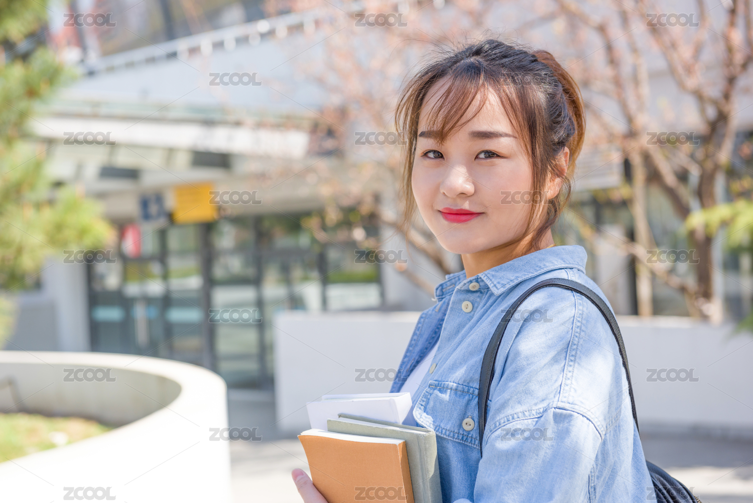 年輕美麗的女大學(xué)生拿著書(shū)本在校園里