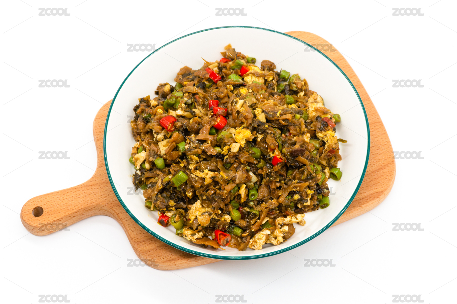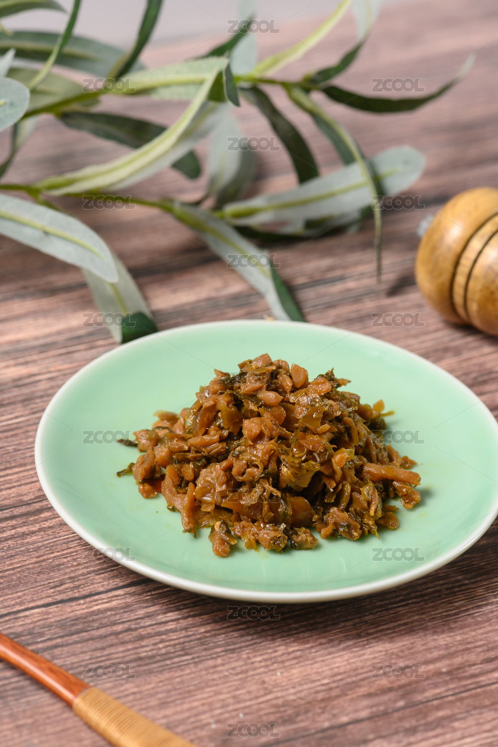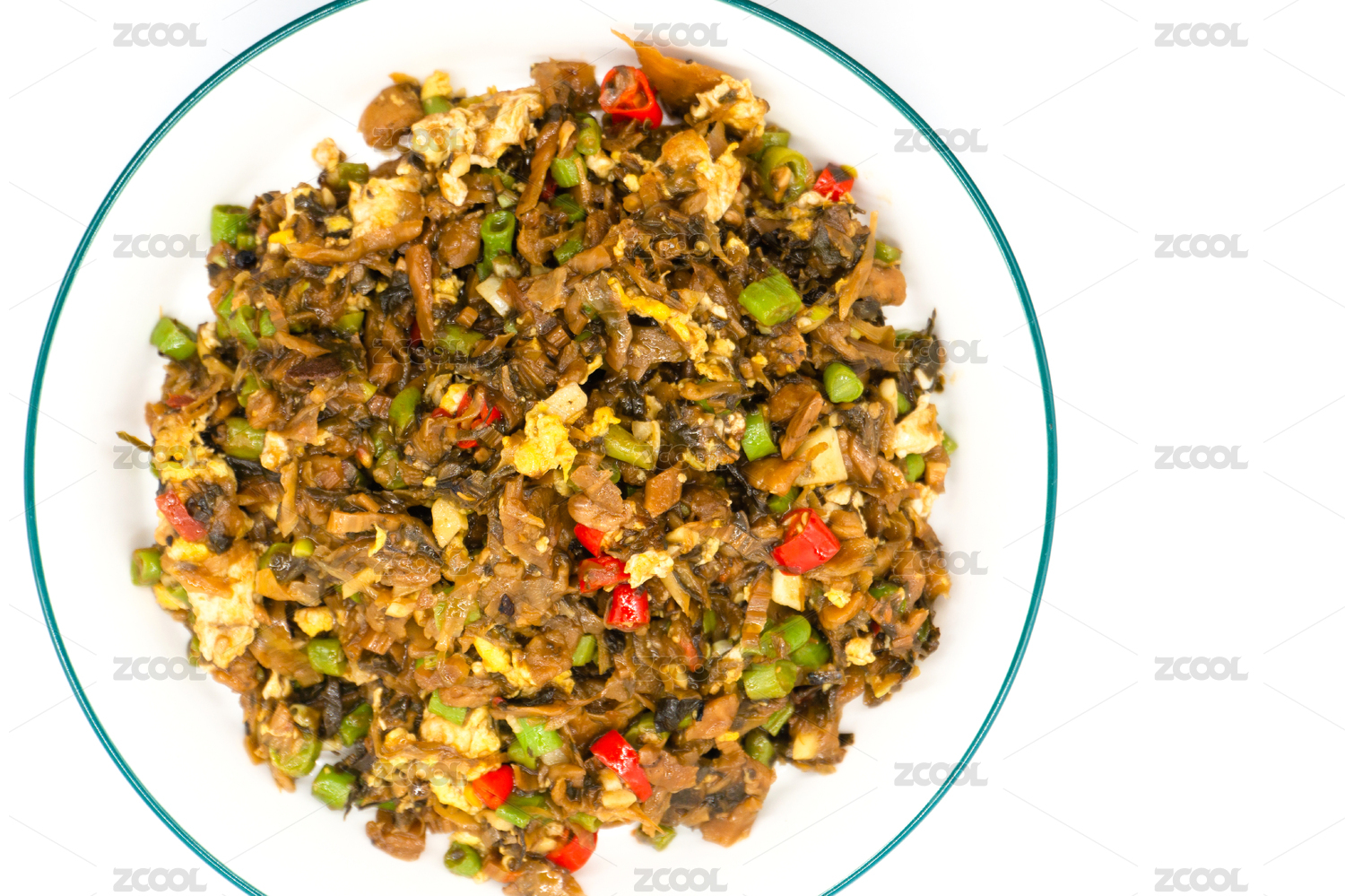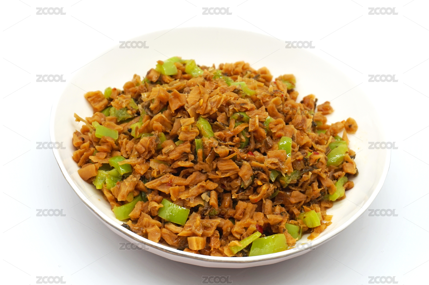 家常菜黃豆炒外婆菜盛放在白瓷盤中