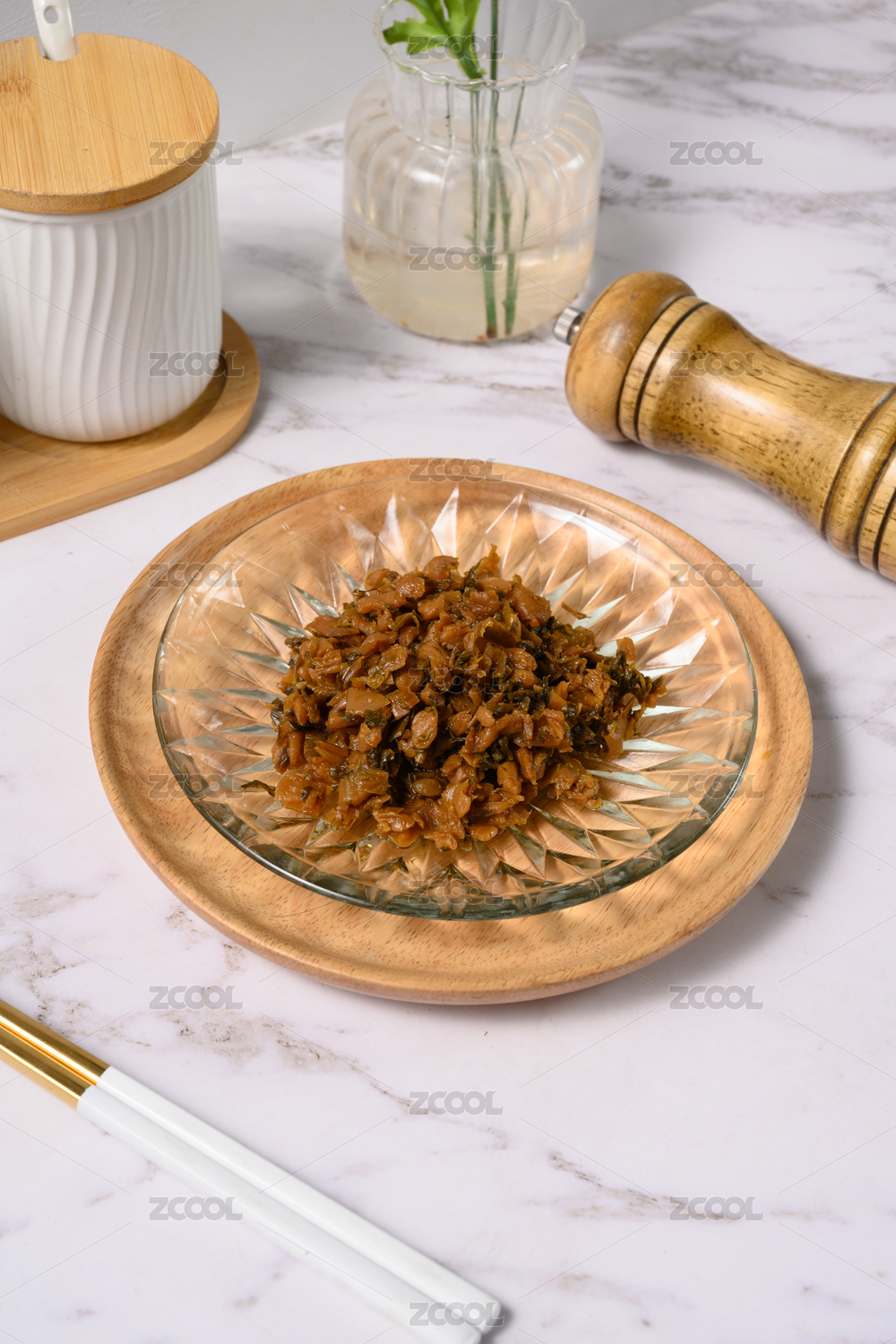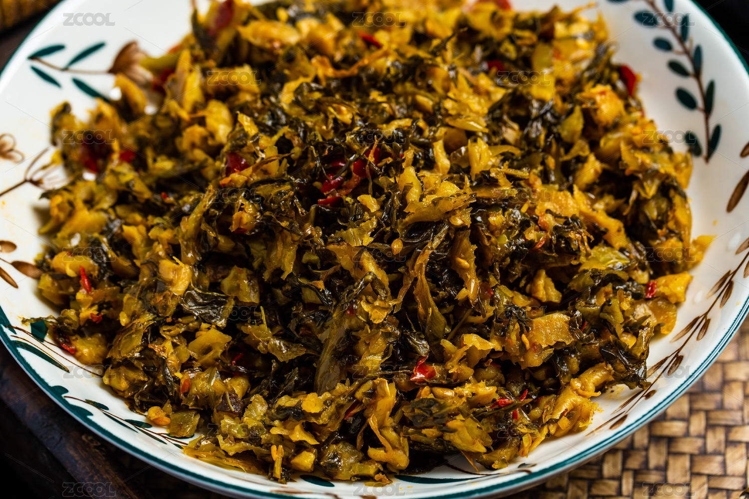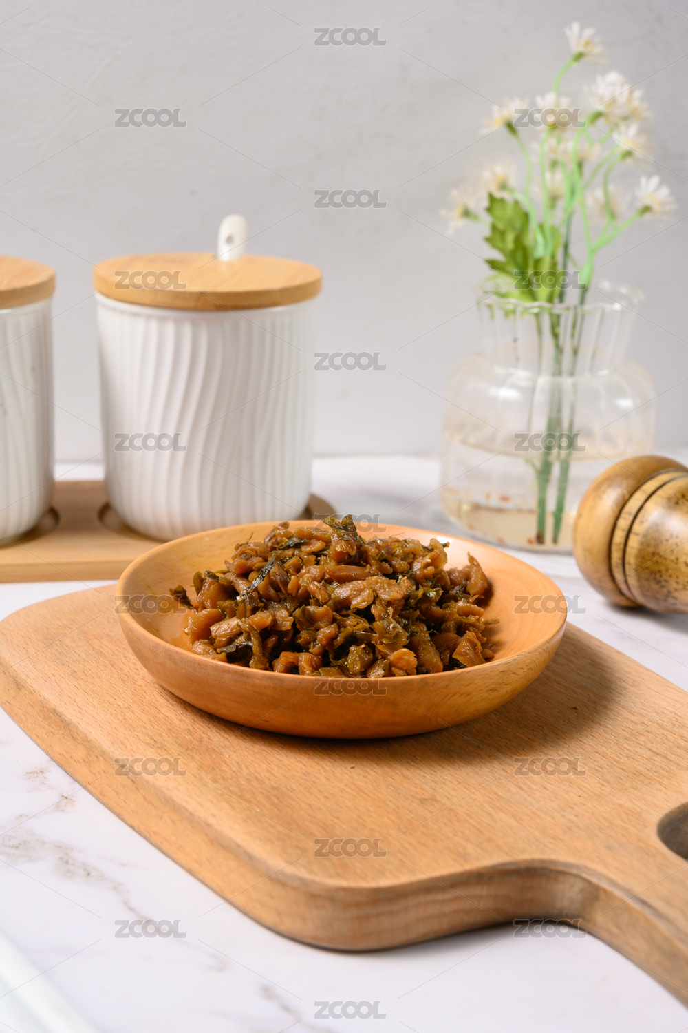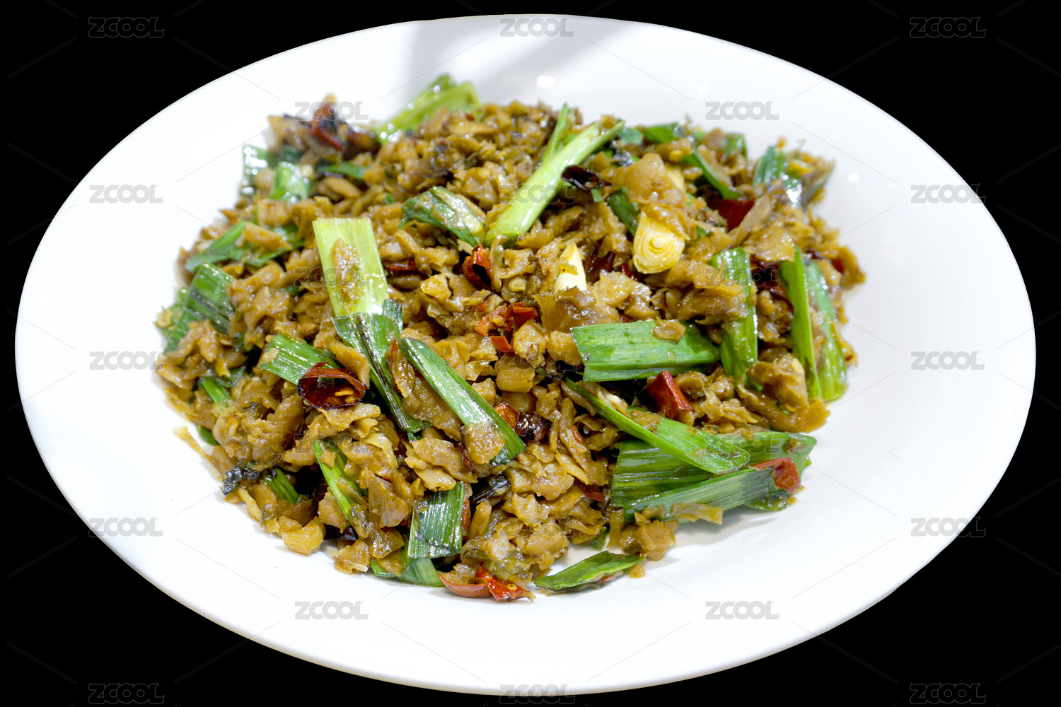 家常菜黃豆炒外婆菜盛放在白瓷盤中