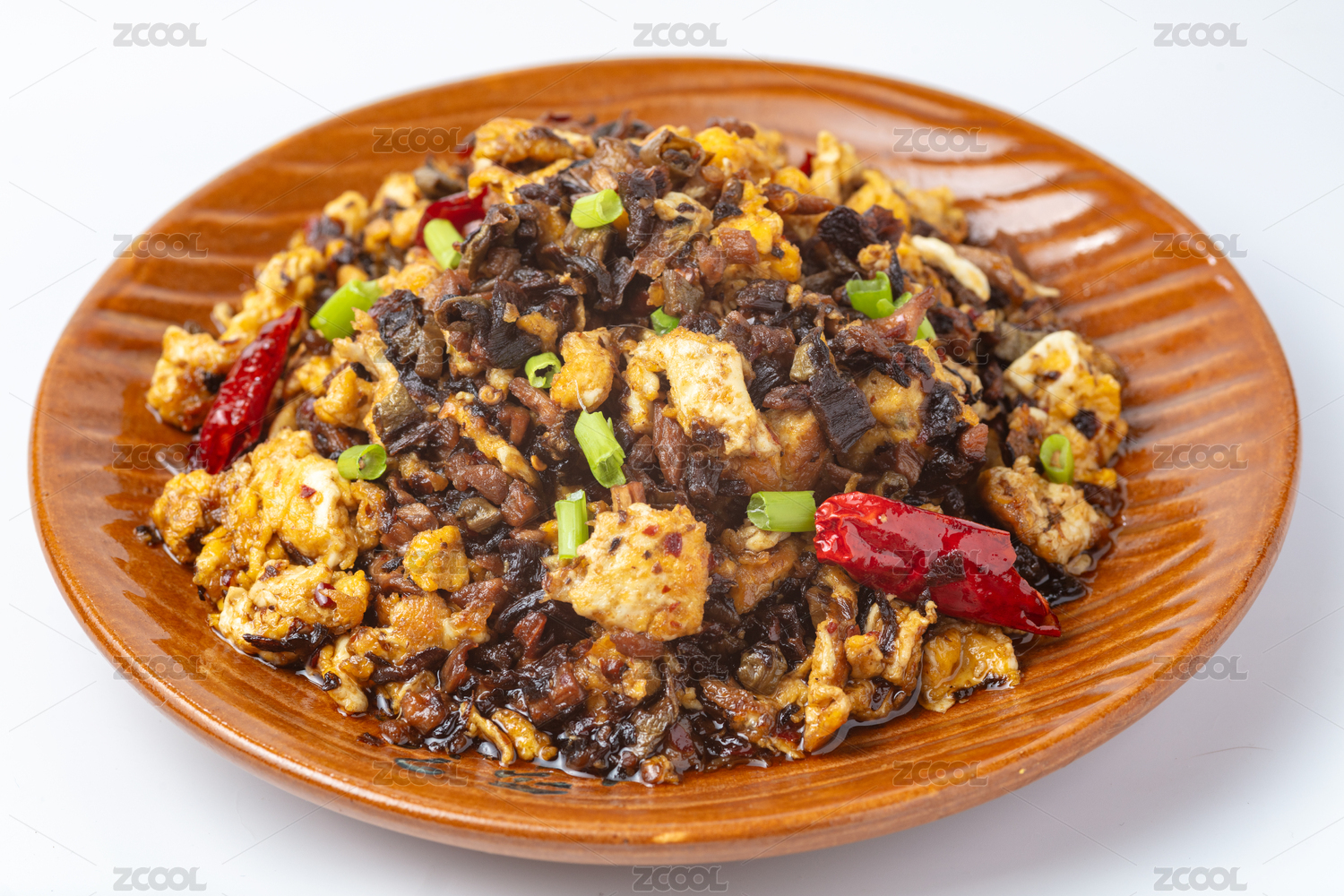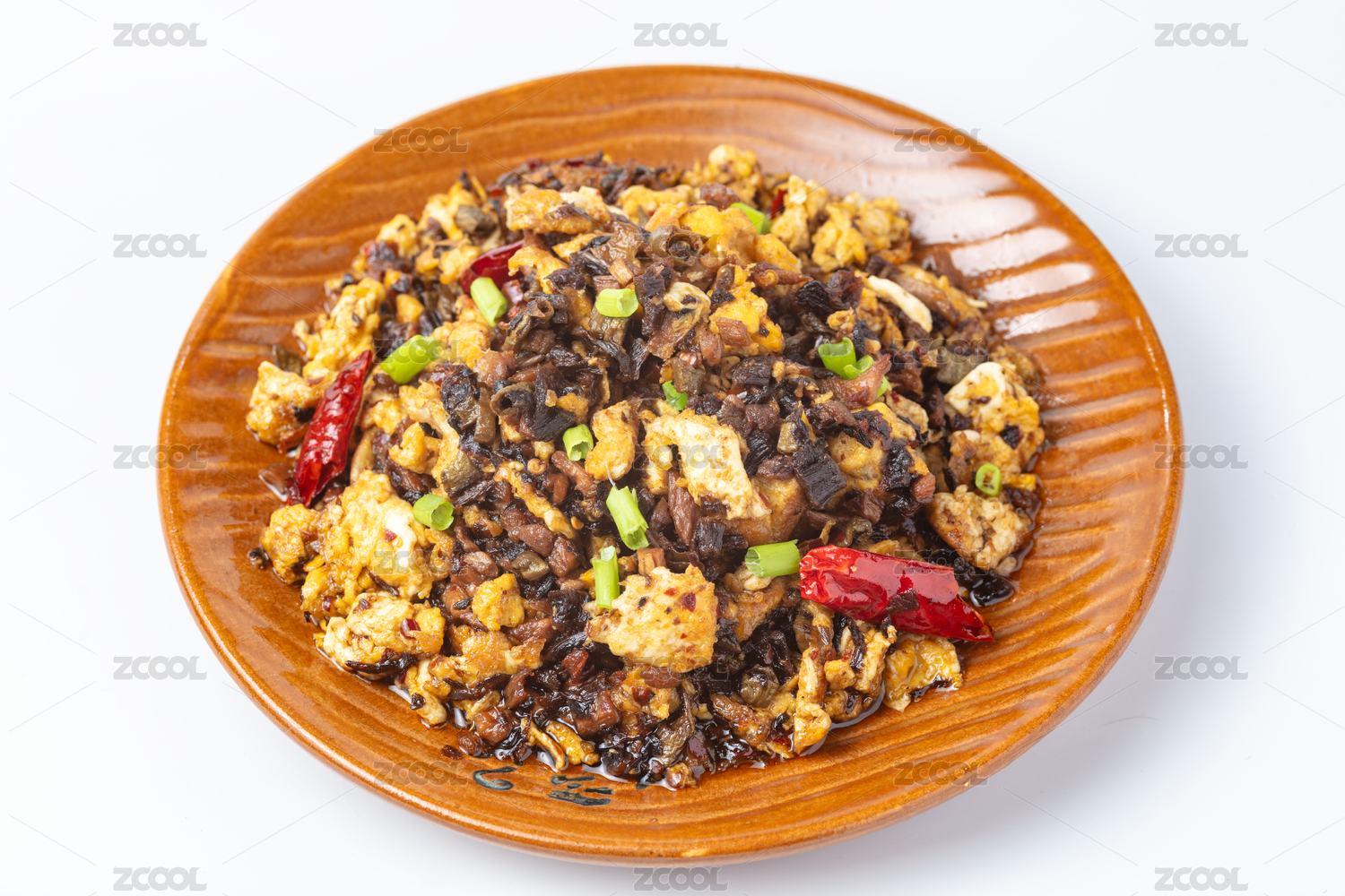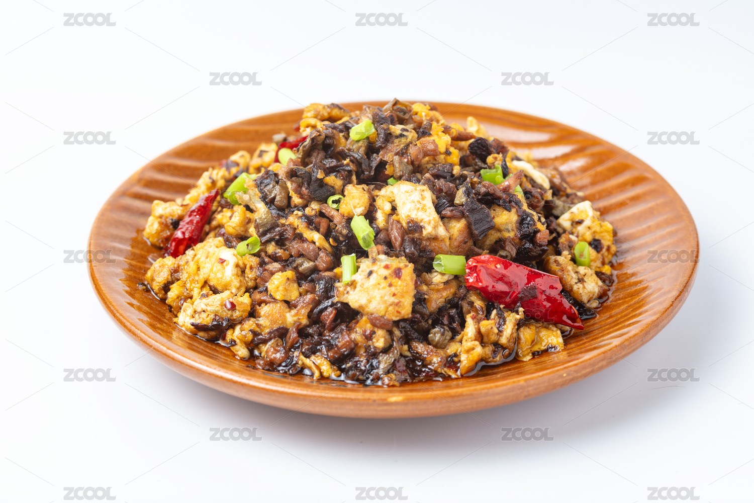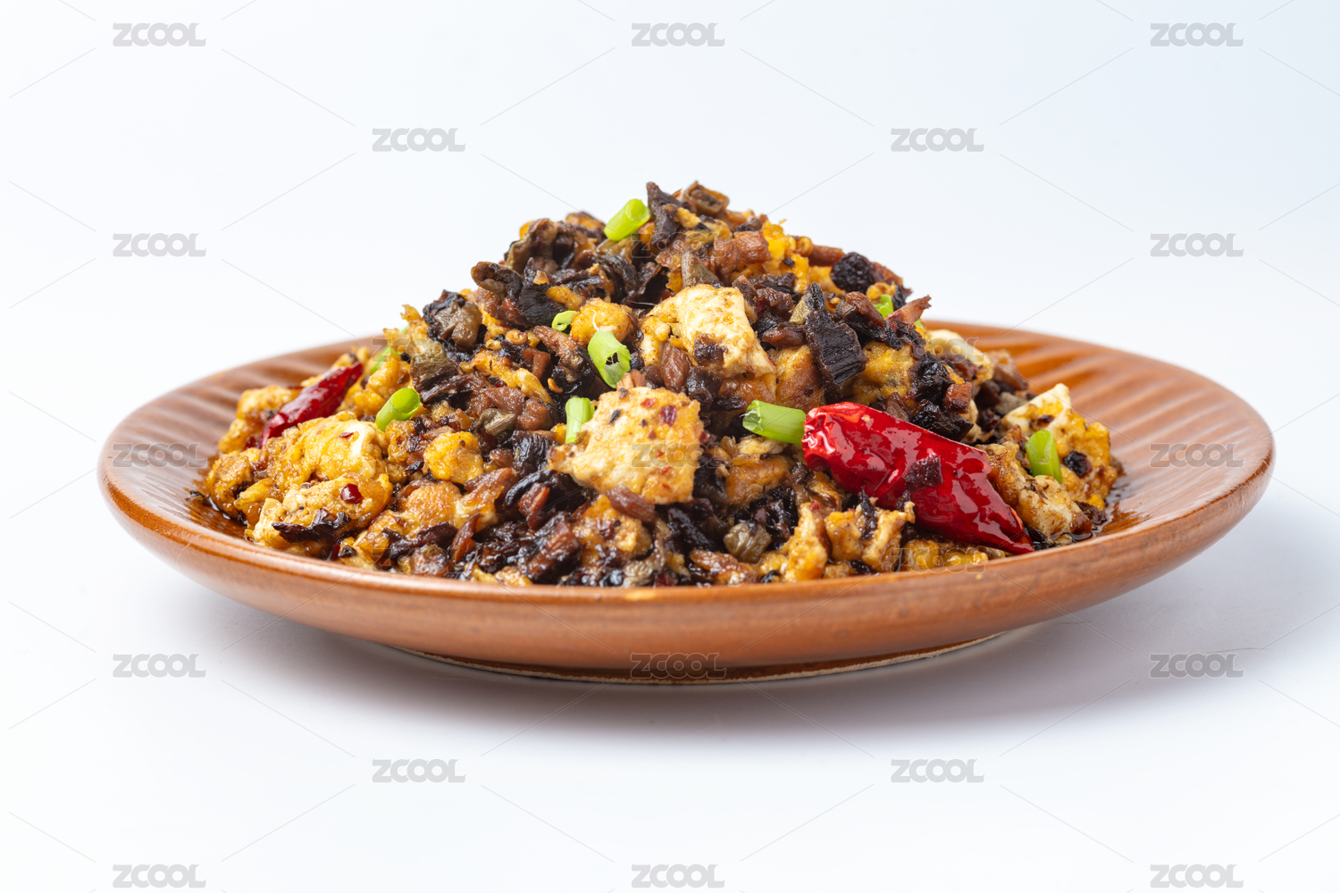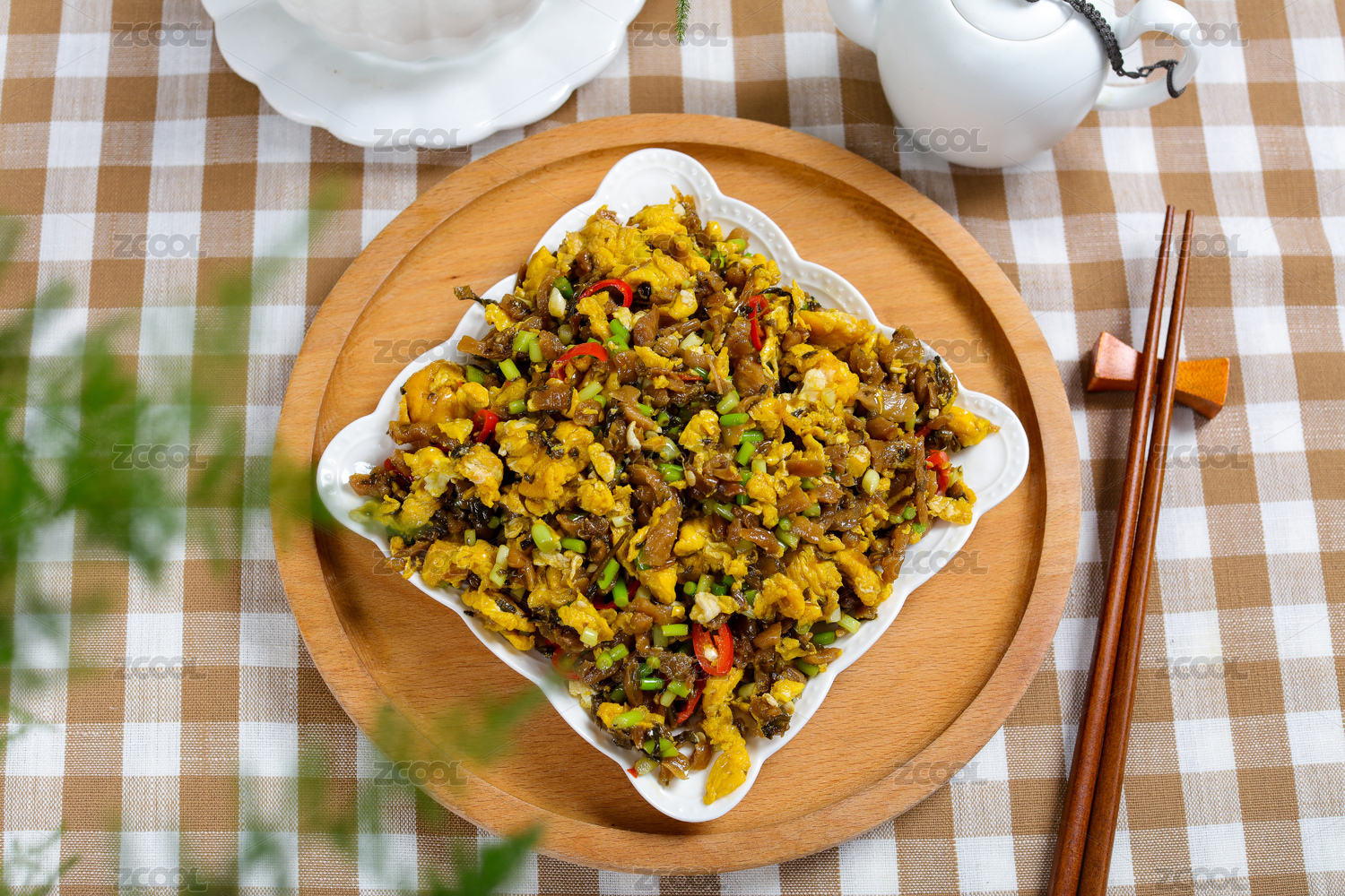 家常菜黃豆炒外婆菜盛放在白瓷盤中