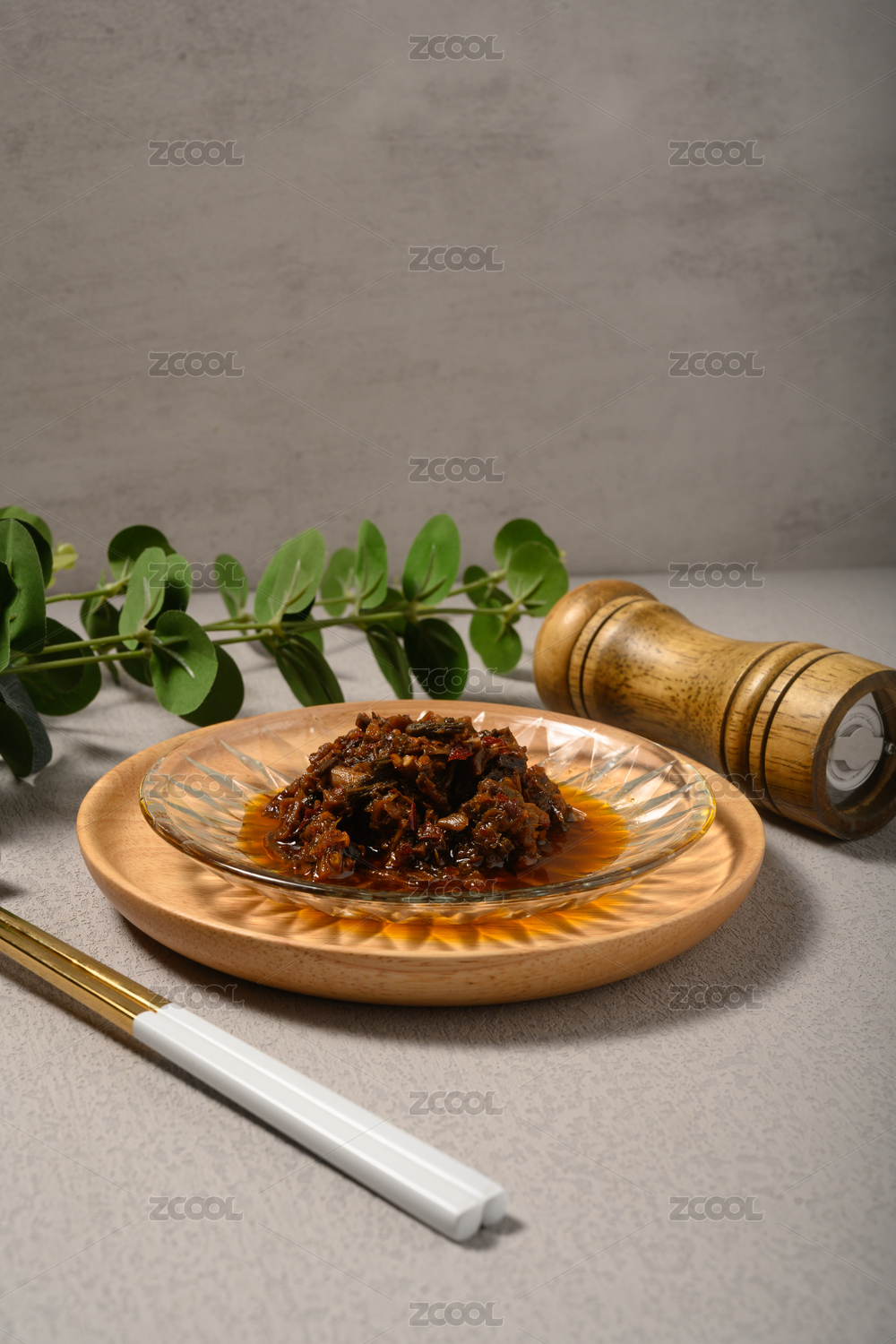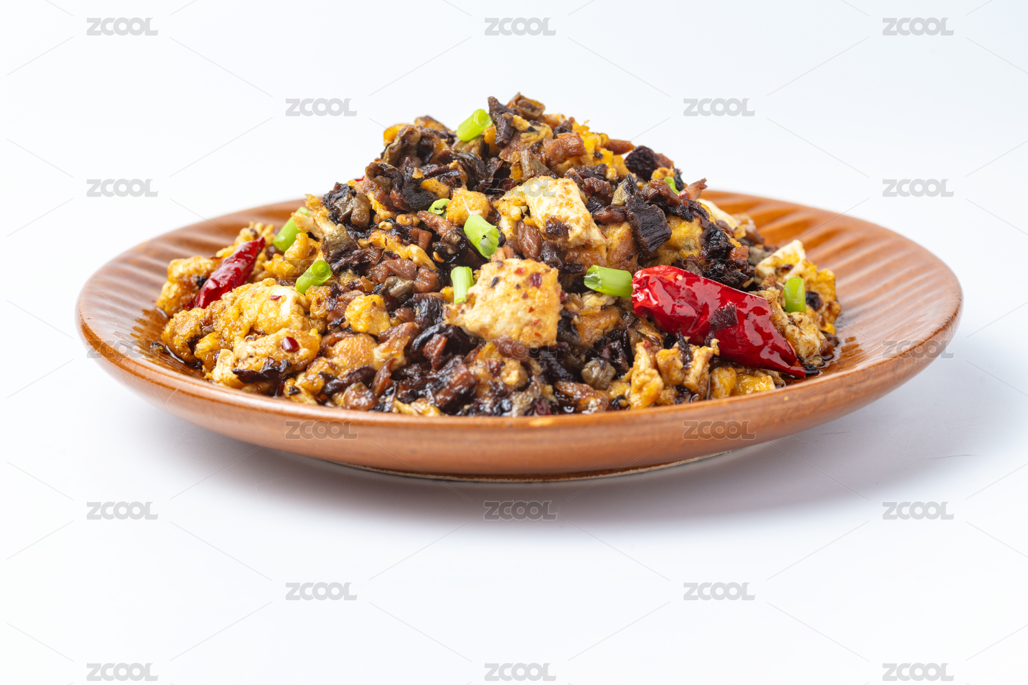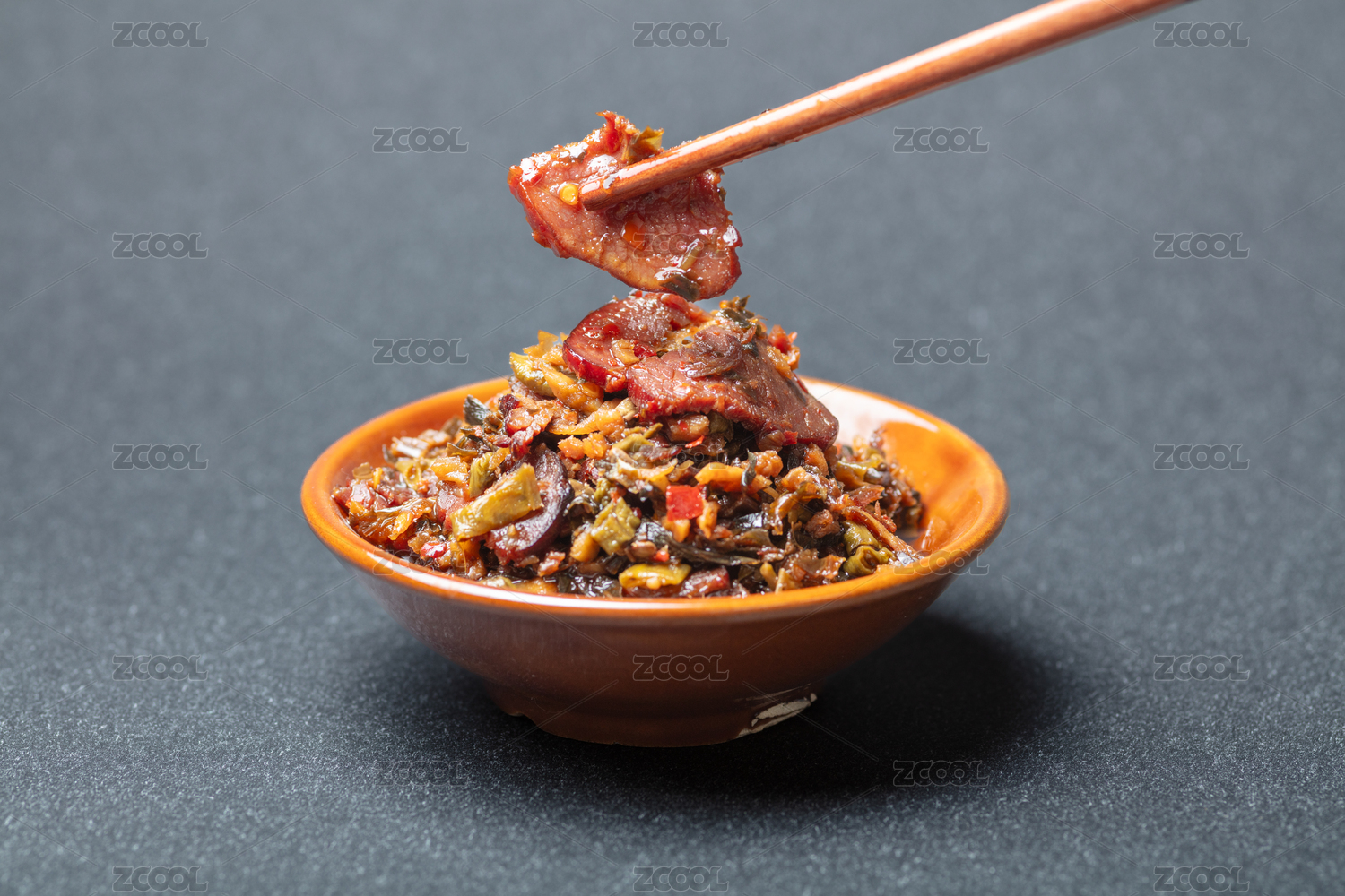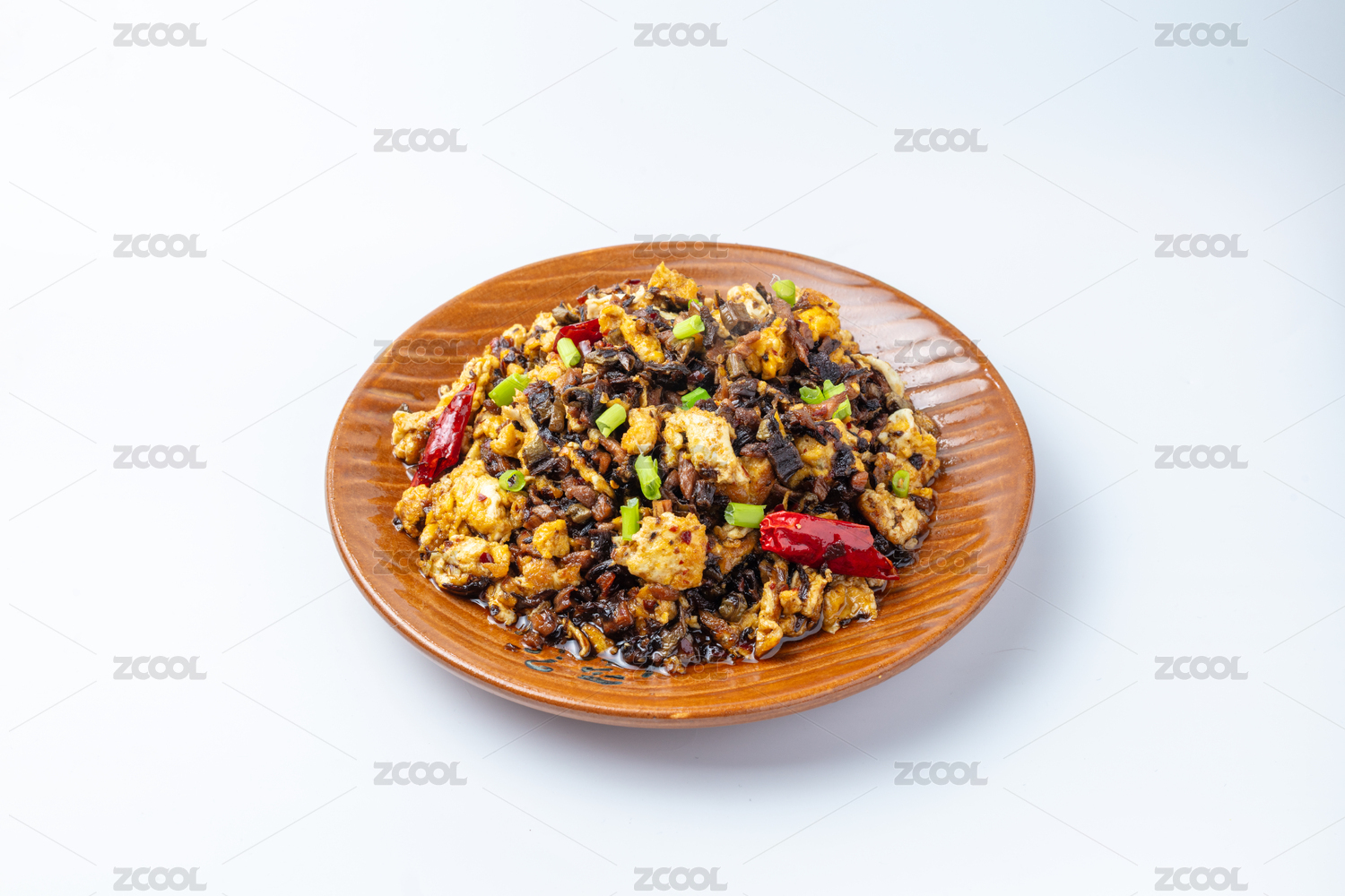 家常菜黃豆炒外婆菜盛放在白瓷盤中