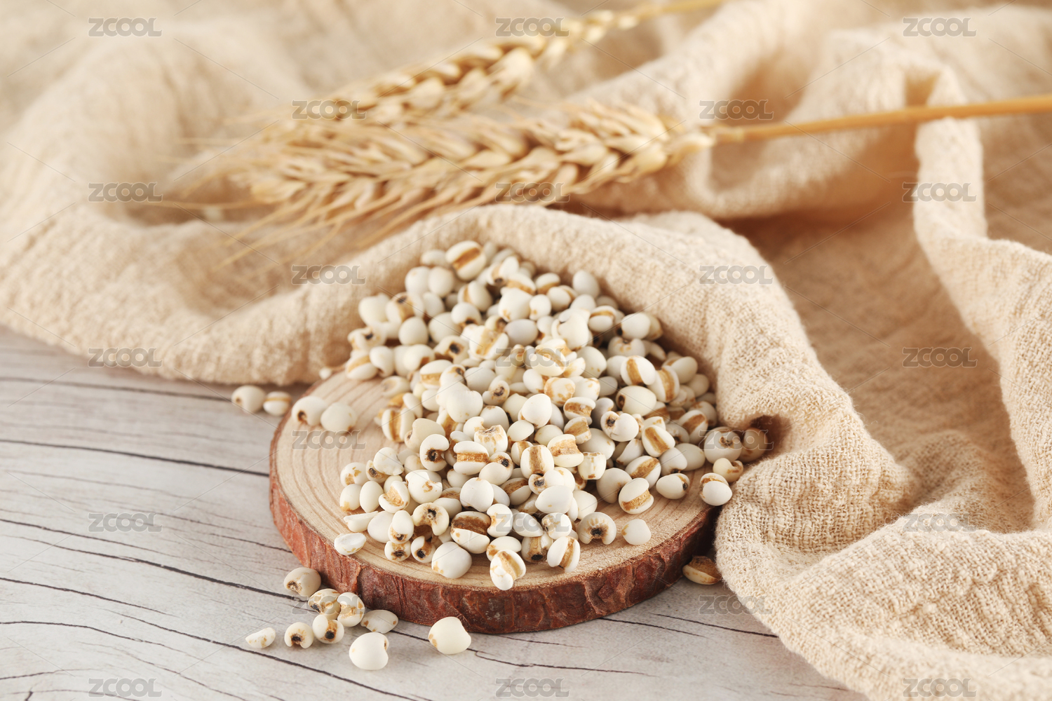 白色的薏仁放在黑色顆粒桌面