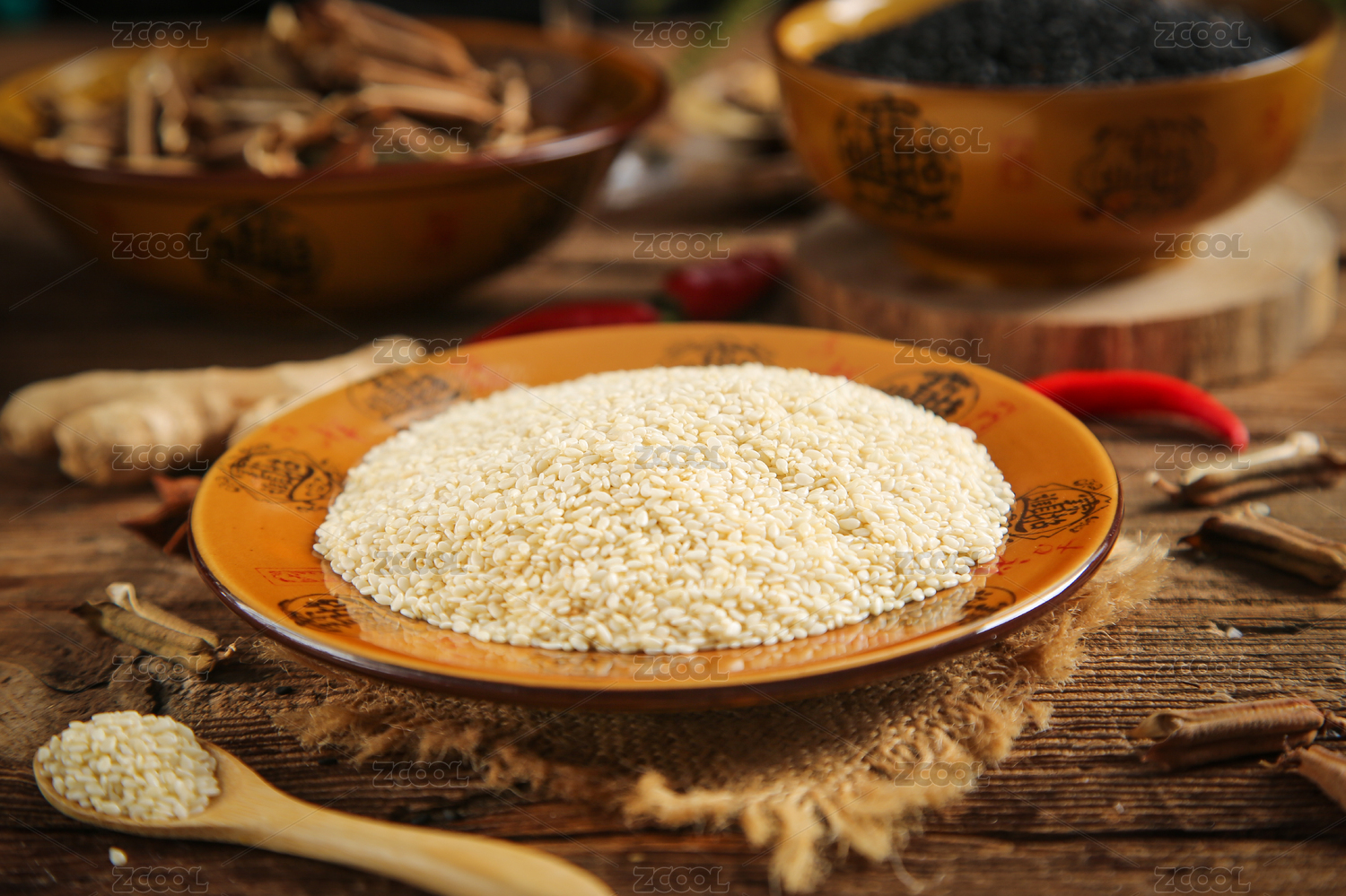 深底上放著一盤白芝麻顆粒