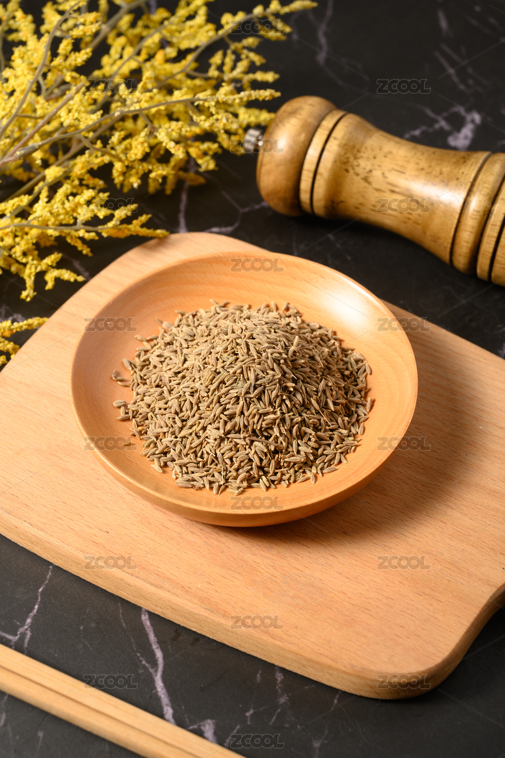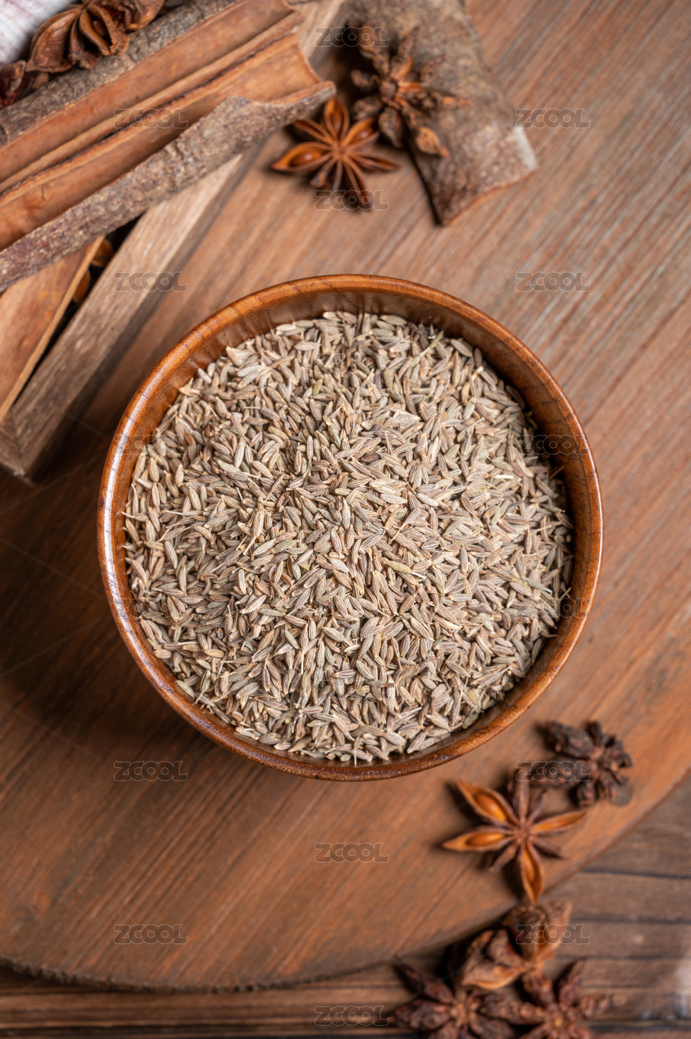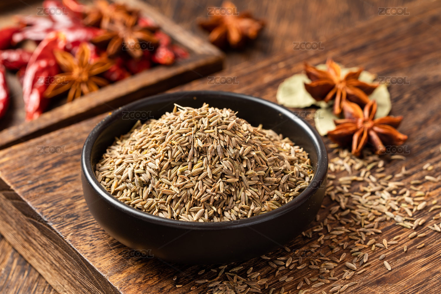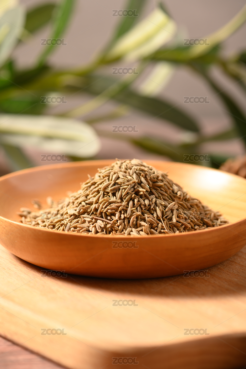 桌面上的木紋盤子里的香氣四溢的孜然