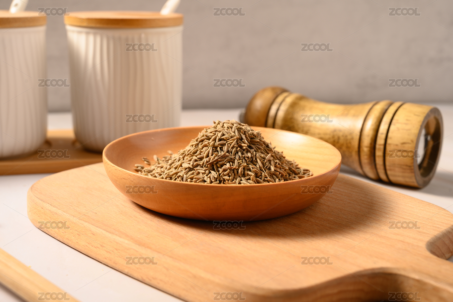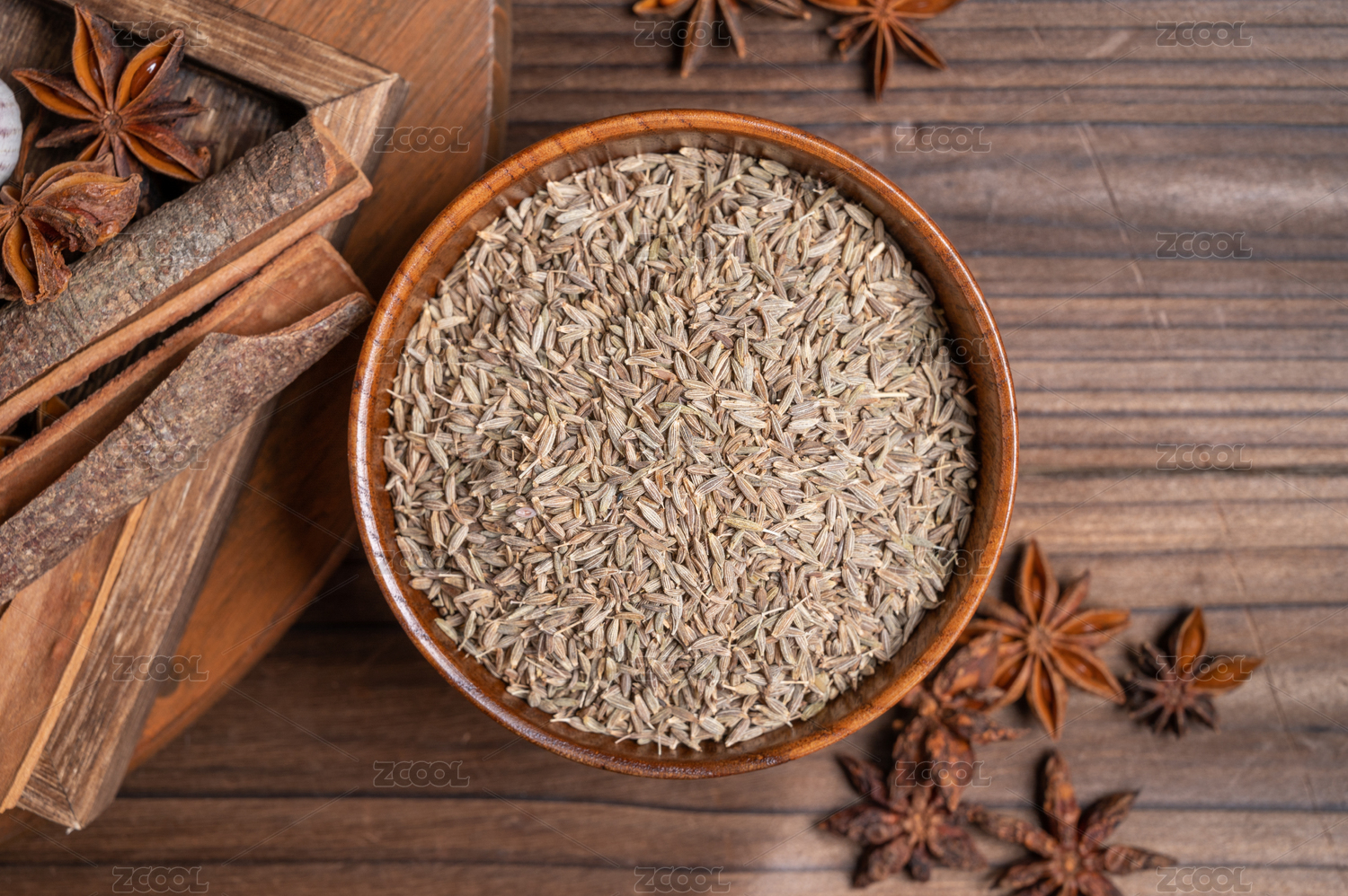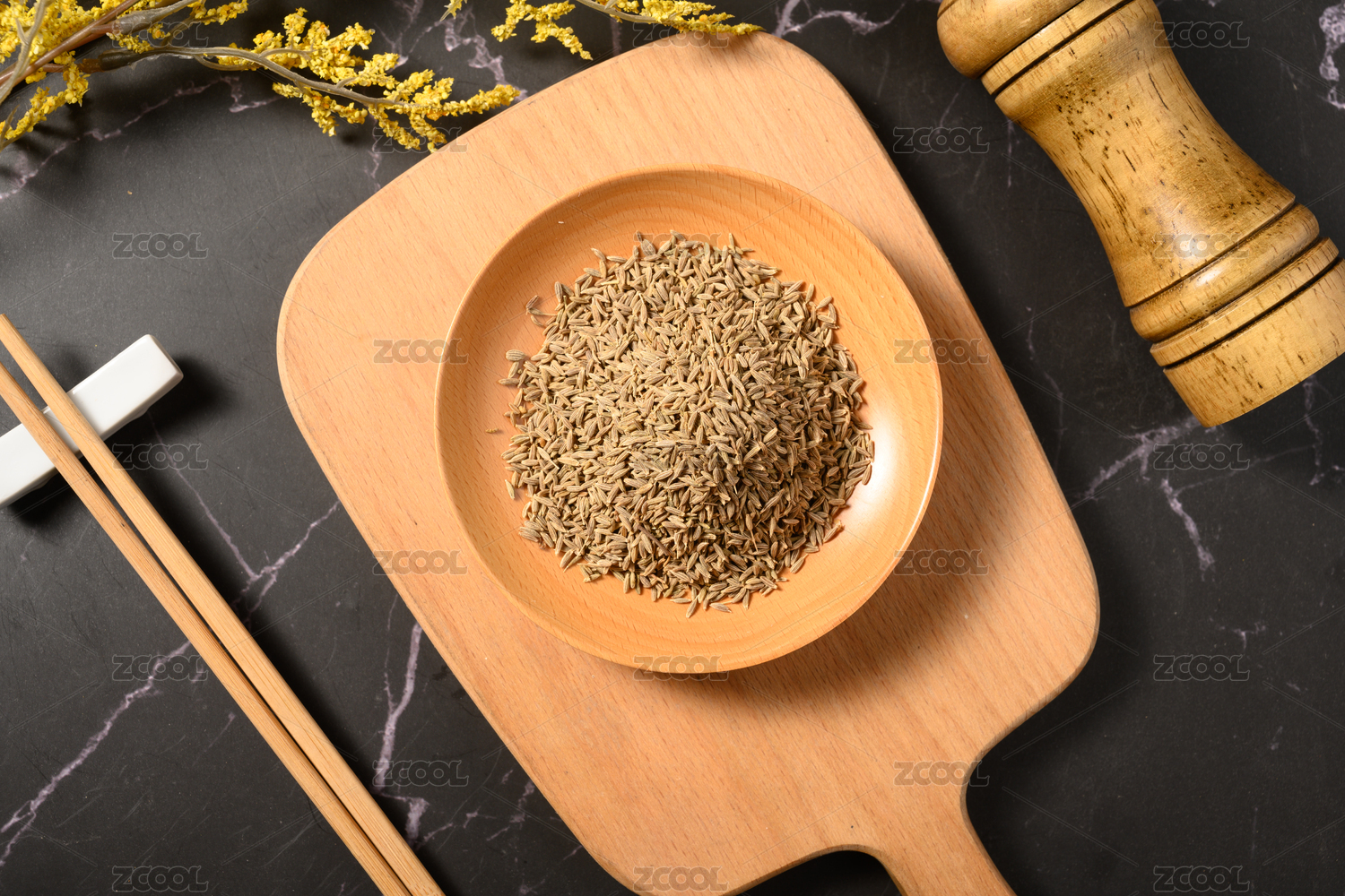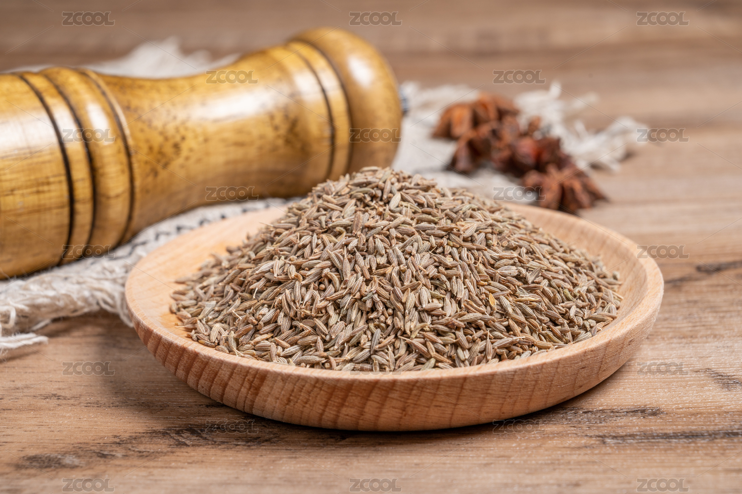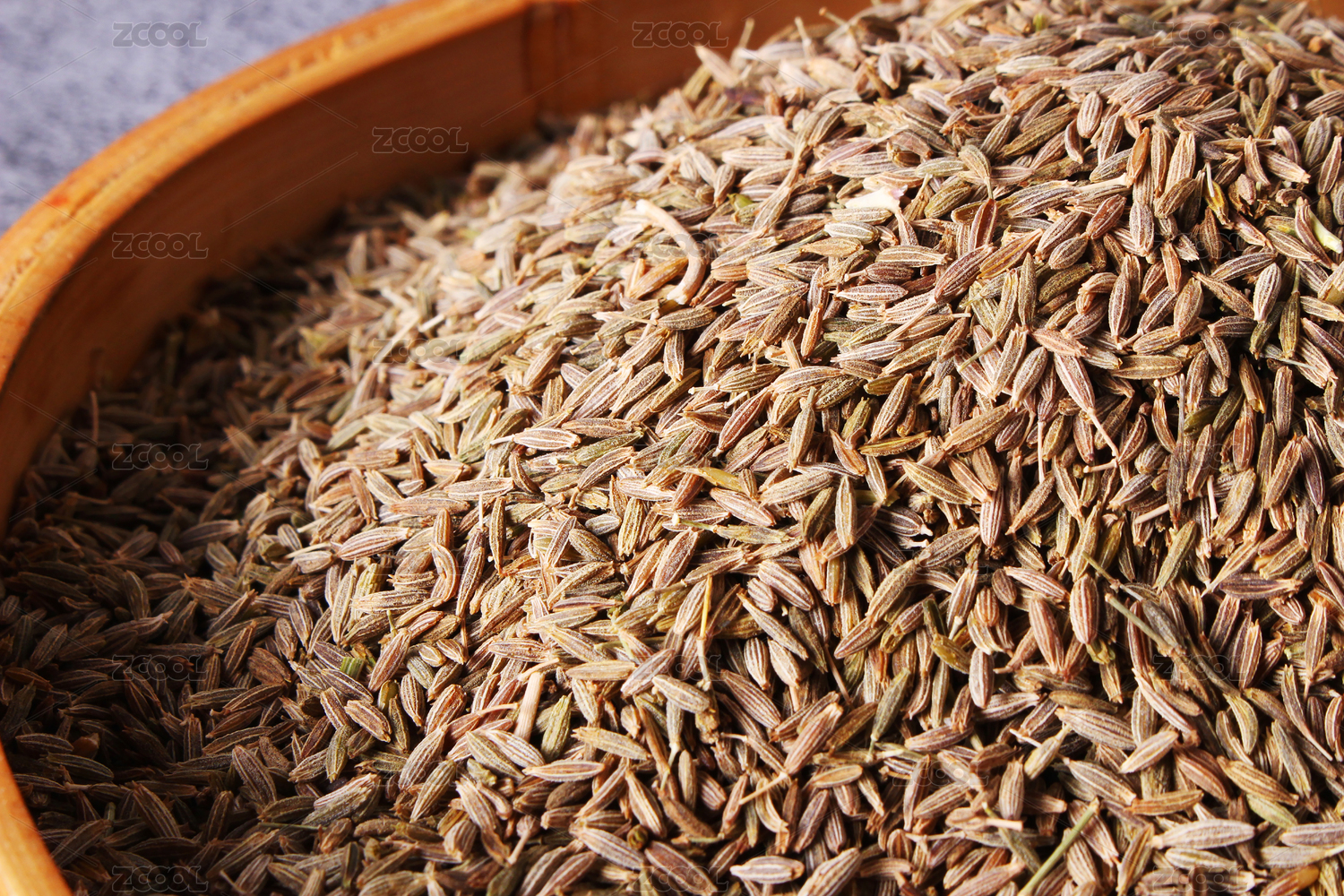 桌面上的木紋盤子里的香氣四溢的孜然
