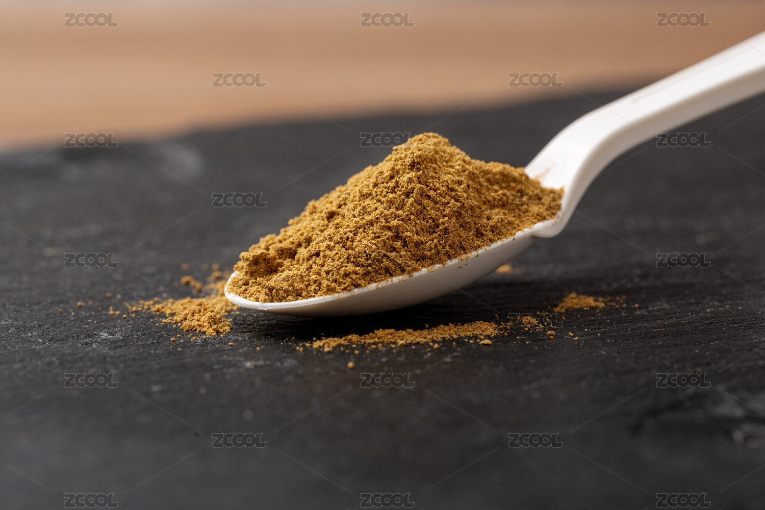 黑色石板上白勺子里的孜然粉