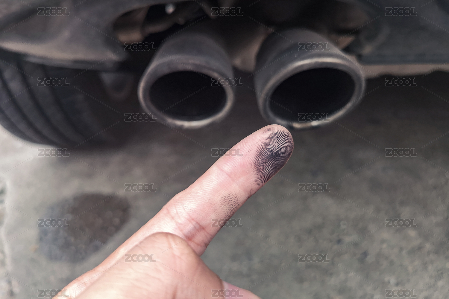 用手指去摸汽車排氣管,檢查汽車積碳,手指頭上被積碳染黑了