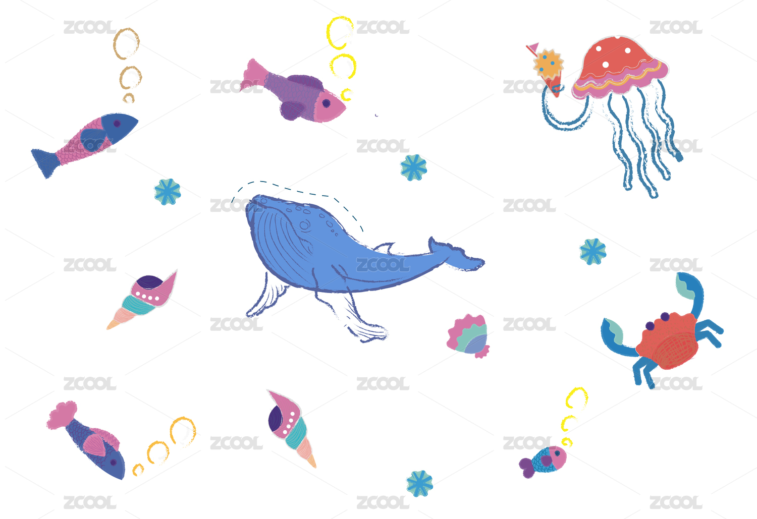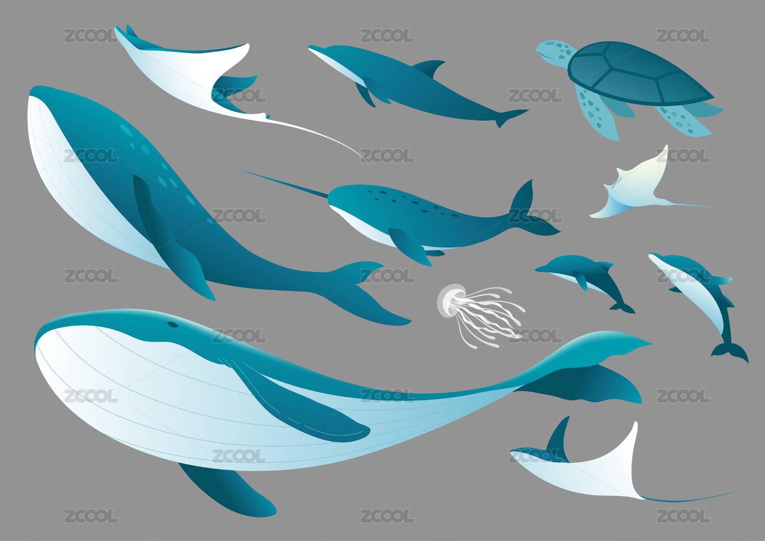 矢量海洋生物插畫組合鯨魚魔鬼魚水母海豚