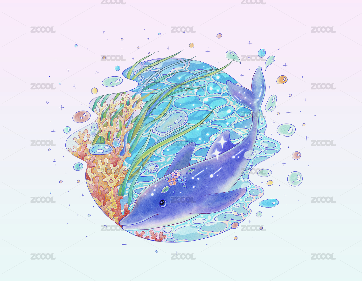 海底世界海豚珊瑚海草氣泡海洋生物圓形圖案