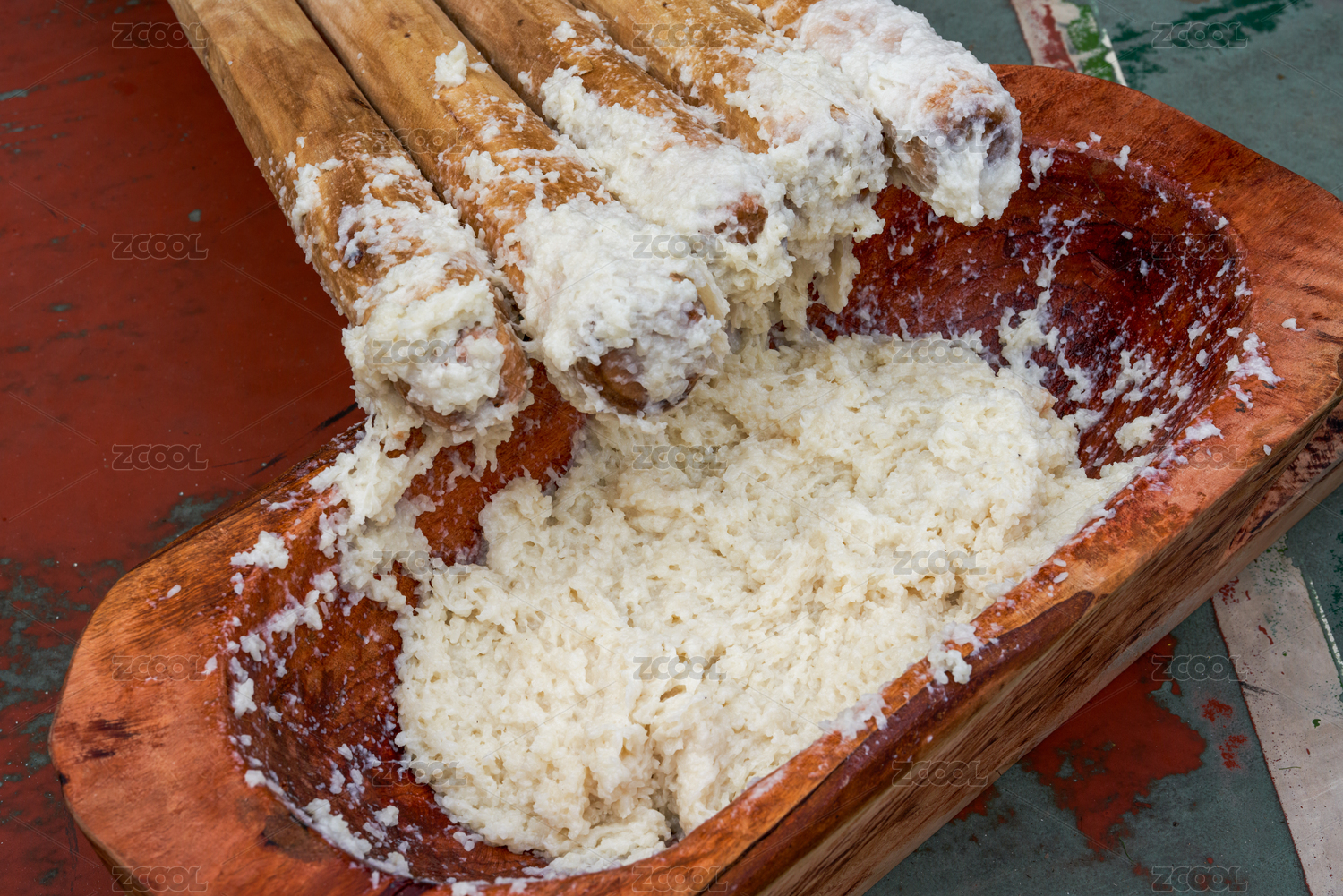 廣西壯族特色打米糕,一群人用木棒錘糯米