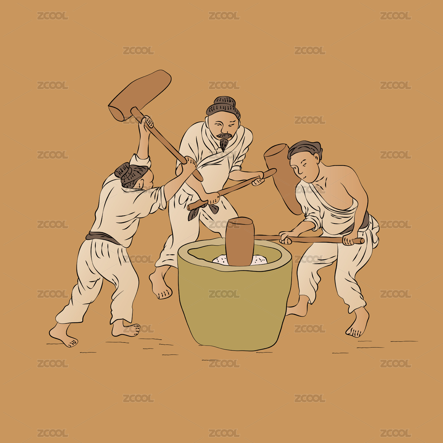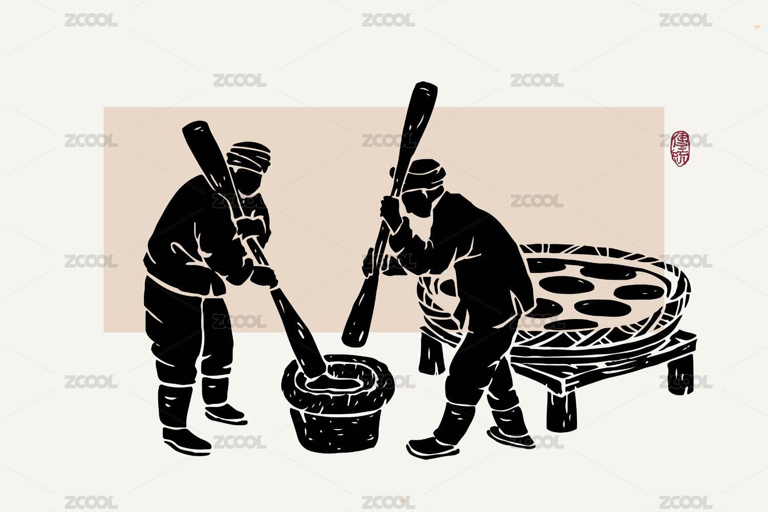 中國風(fēng)風(fēng)俗傳統(tǒng)美食古人打糍粑手繪矢量插畫