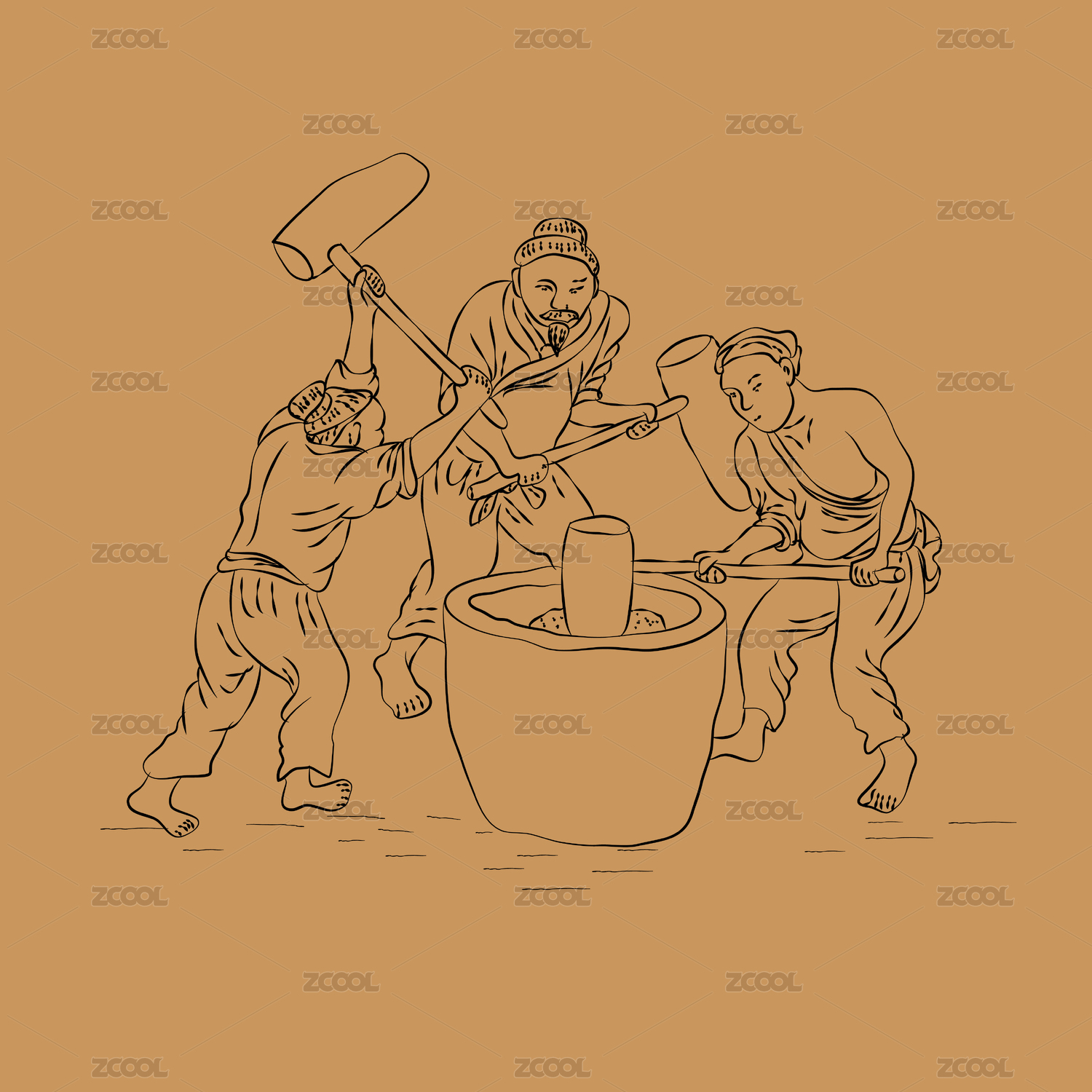 中國風(fēng)風(fēng)俗傳統(tǒng)美食古人打糍粑手繪矢量線稿
