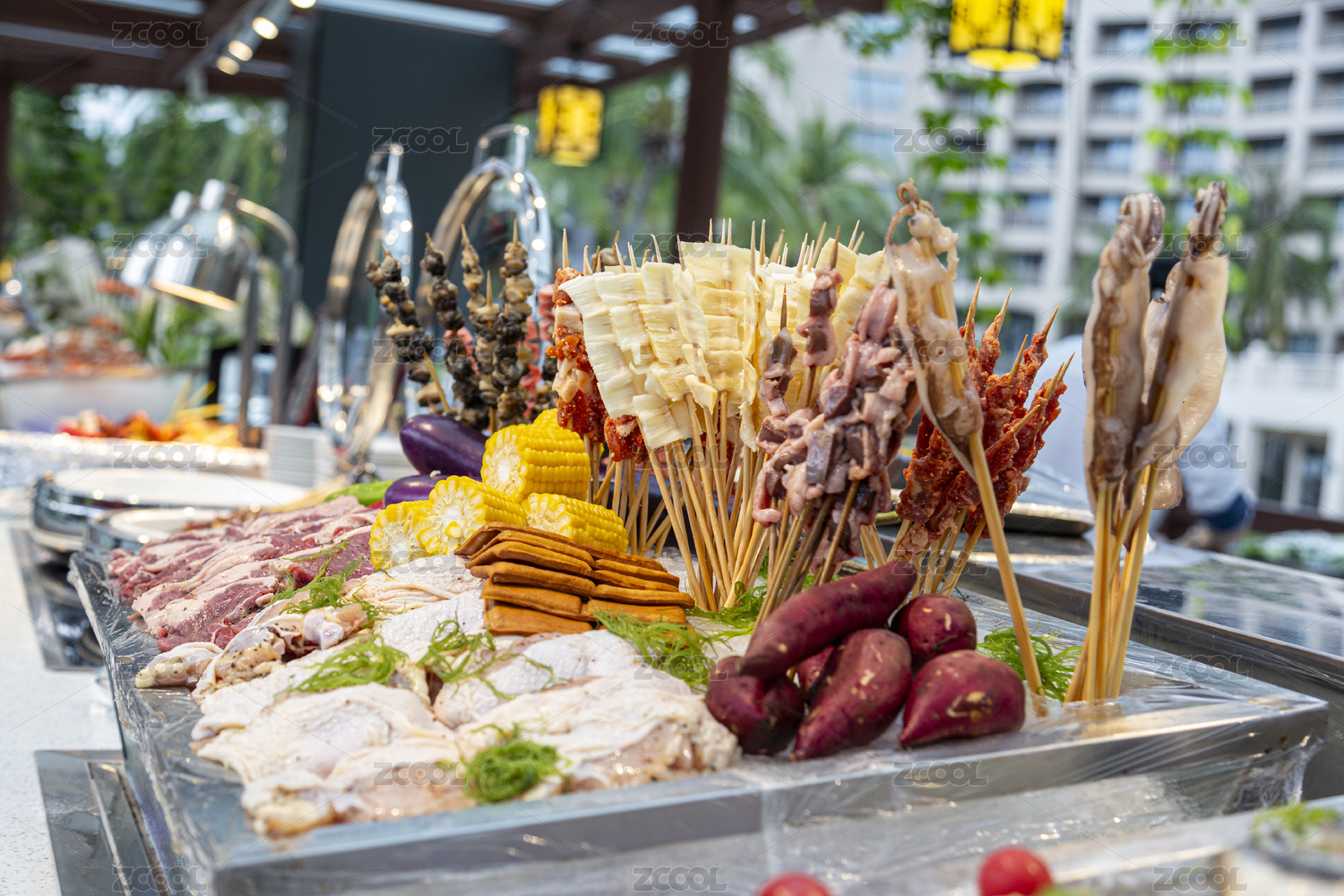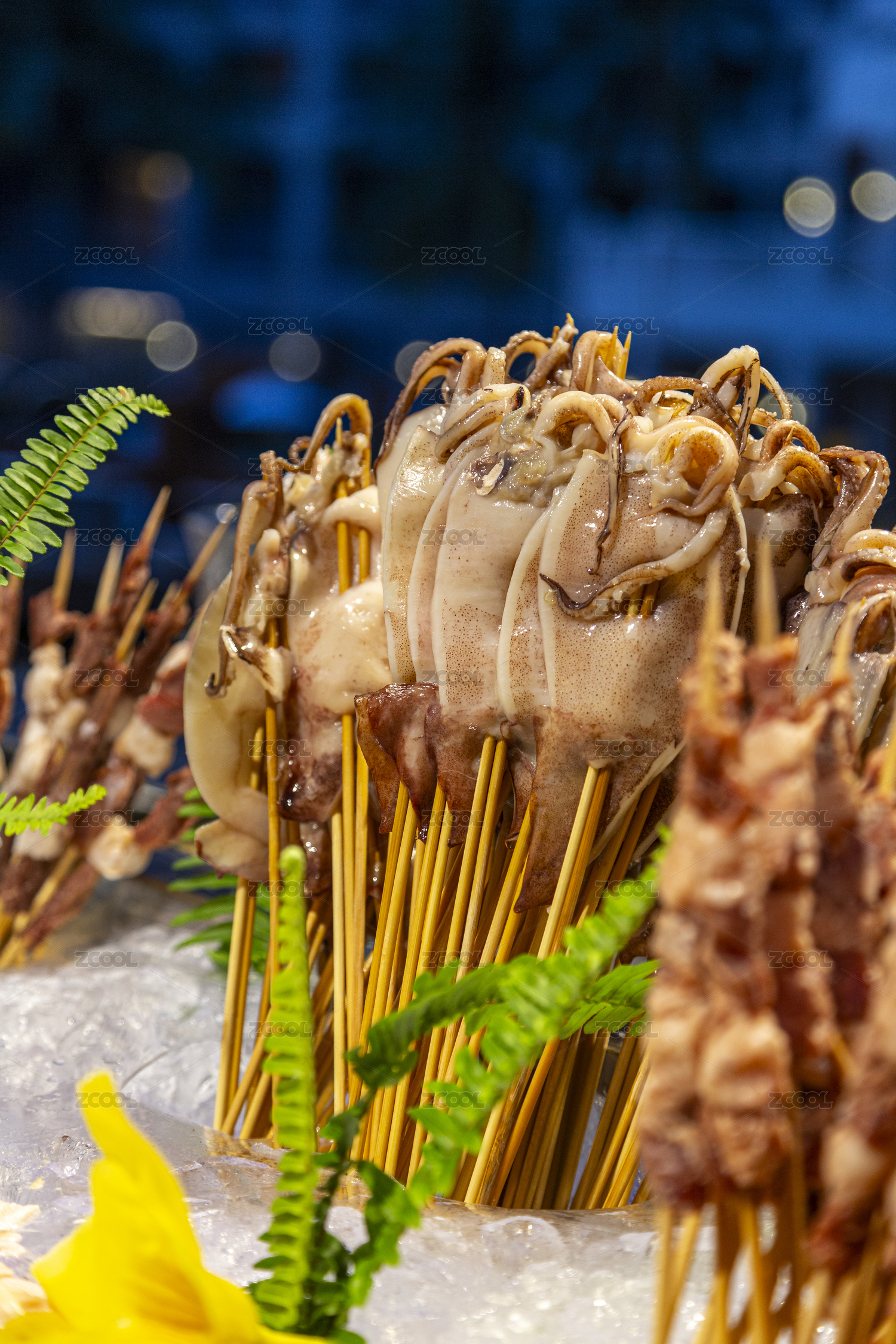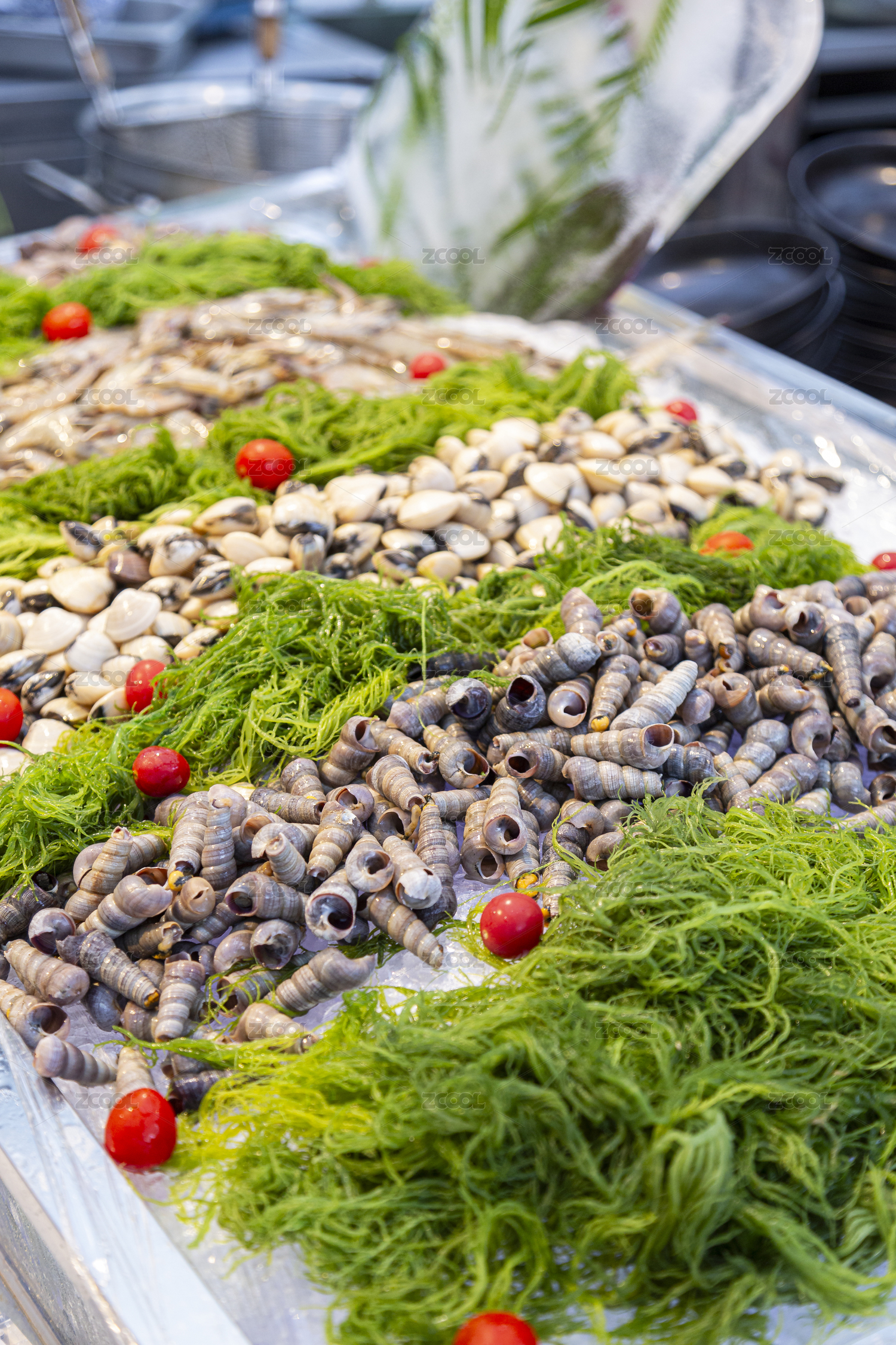 海鮮攤位的貝類(lèi)及魷魚(yú)陳列