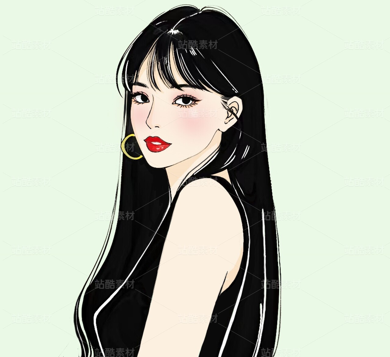 黑發(fā)紅唇美女頭像臉部特寫手繪插畫
