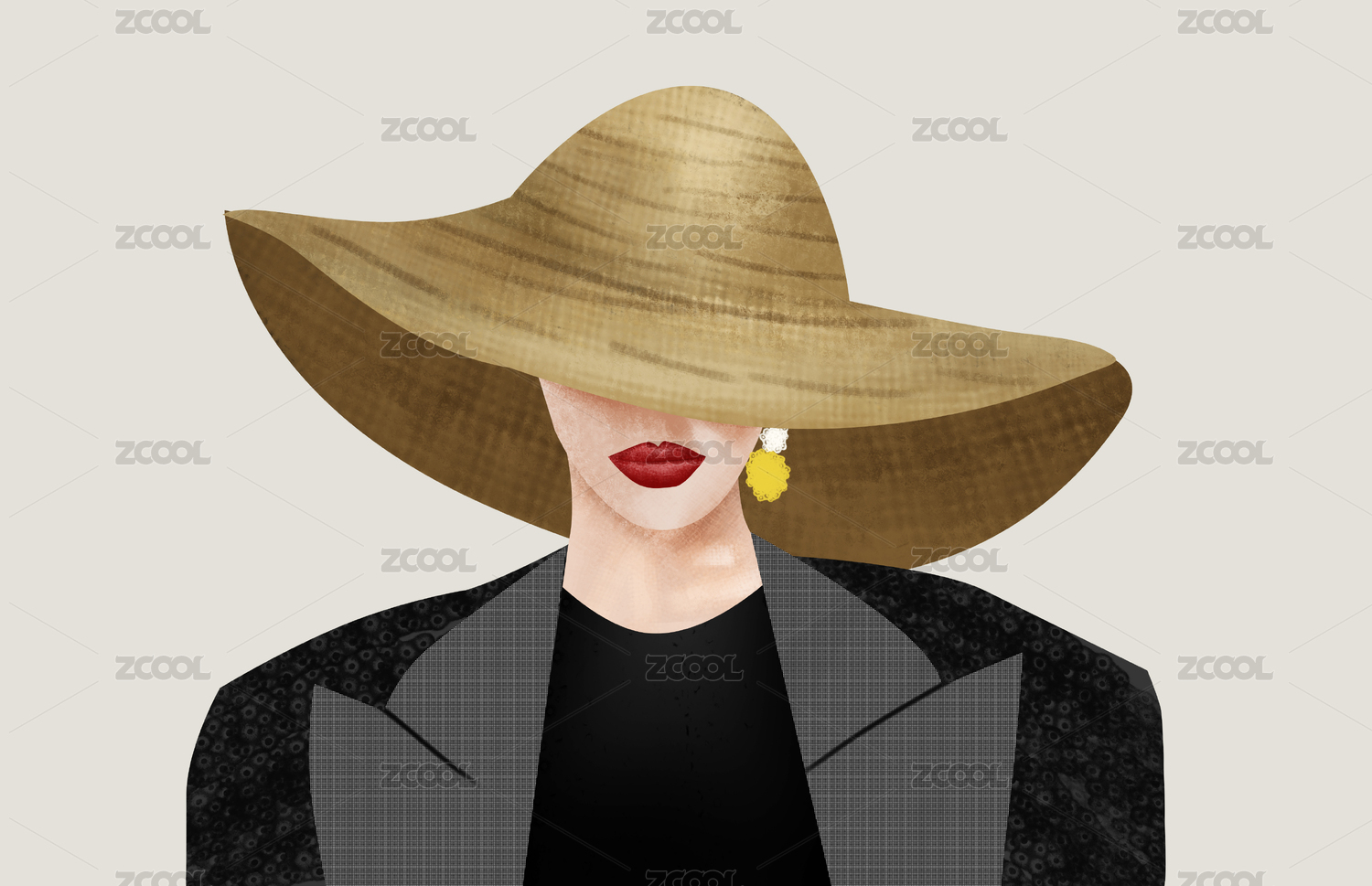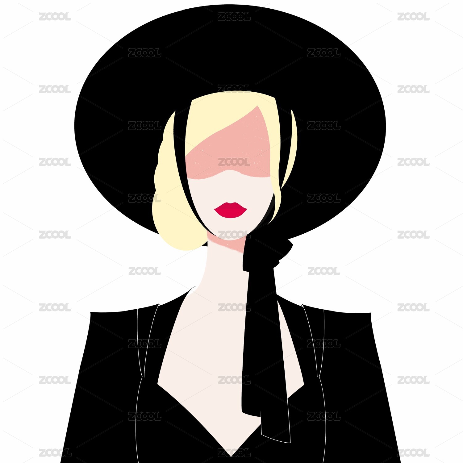 手繪戴帽子的性感紅唇時(shí)尚美女簡約人物插畫