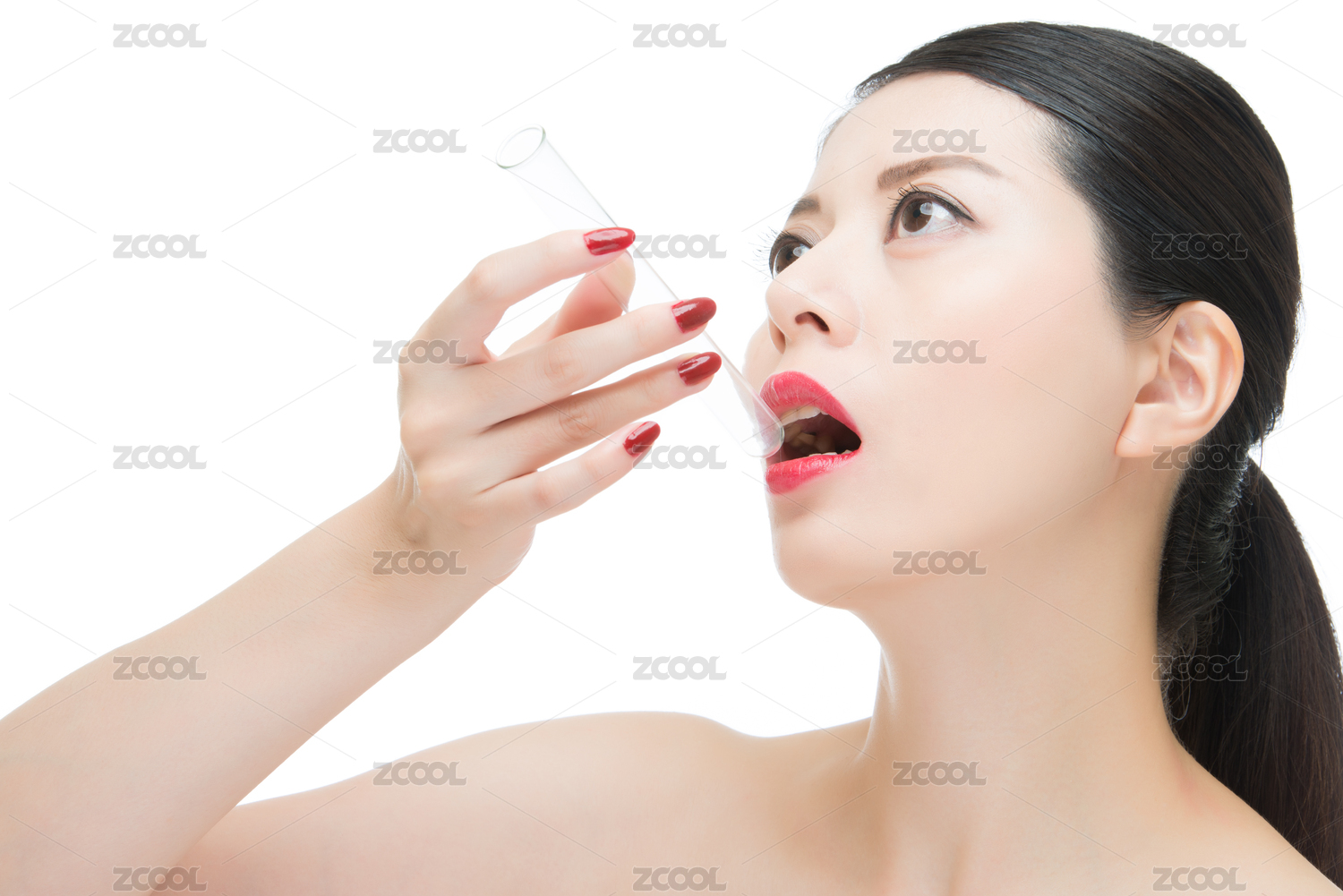 性感的亞洲女人紅唇指甲,吃的化學(xué)測試實(shí)驗(yàn)室管,隔絕在白色背景