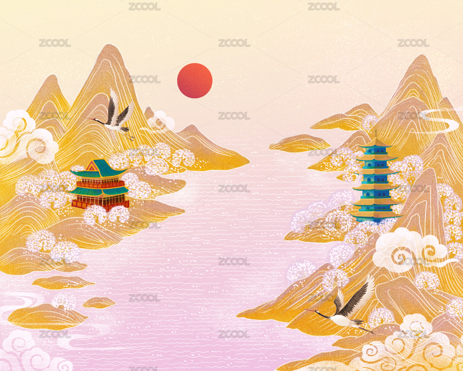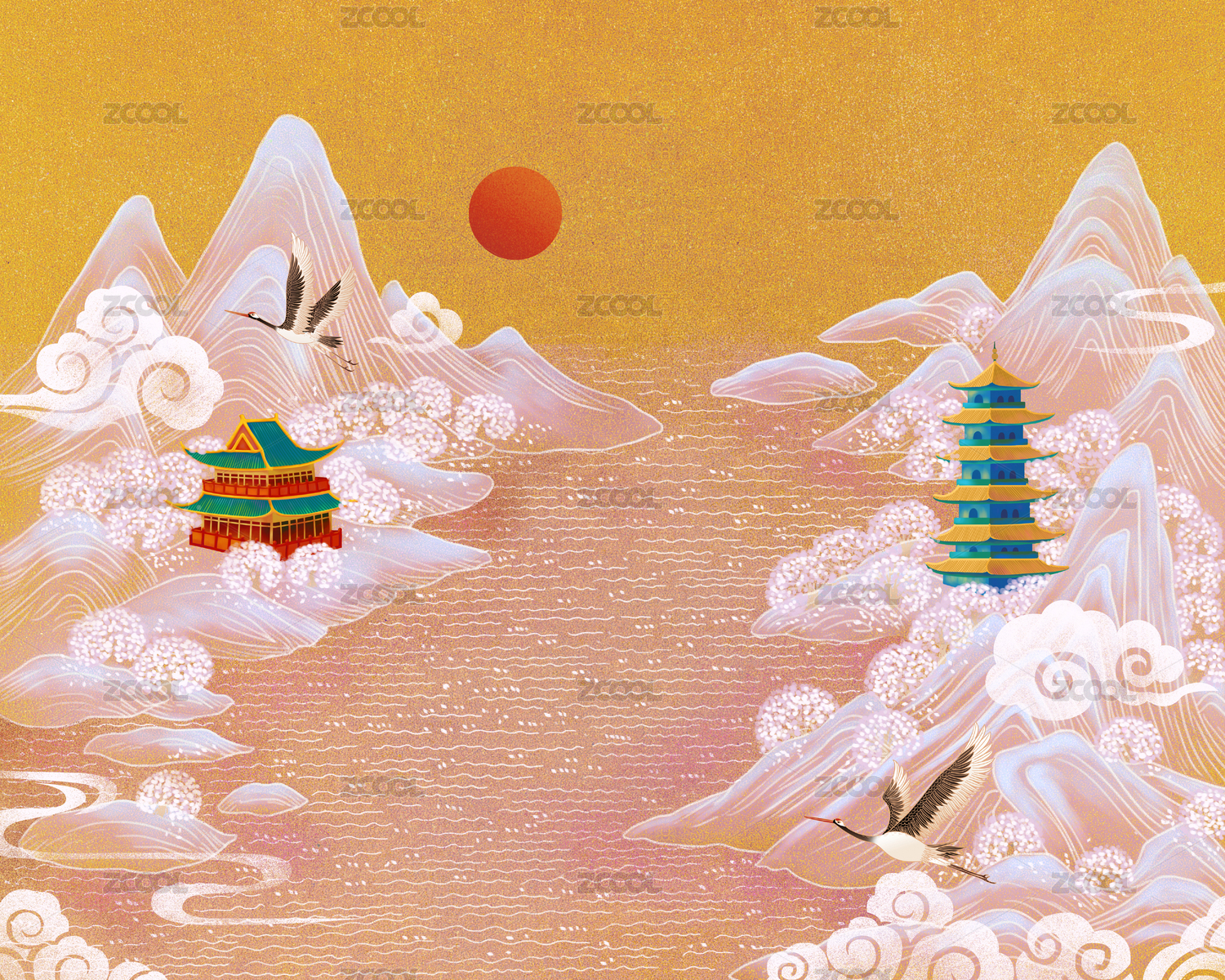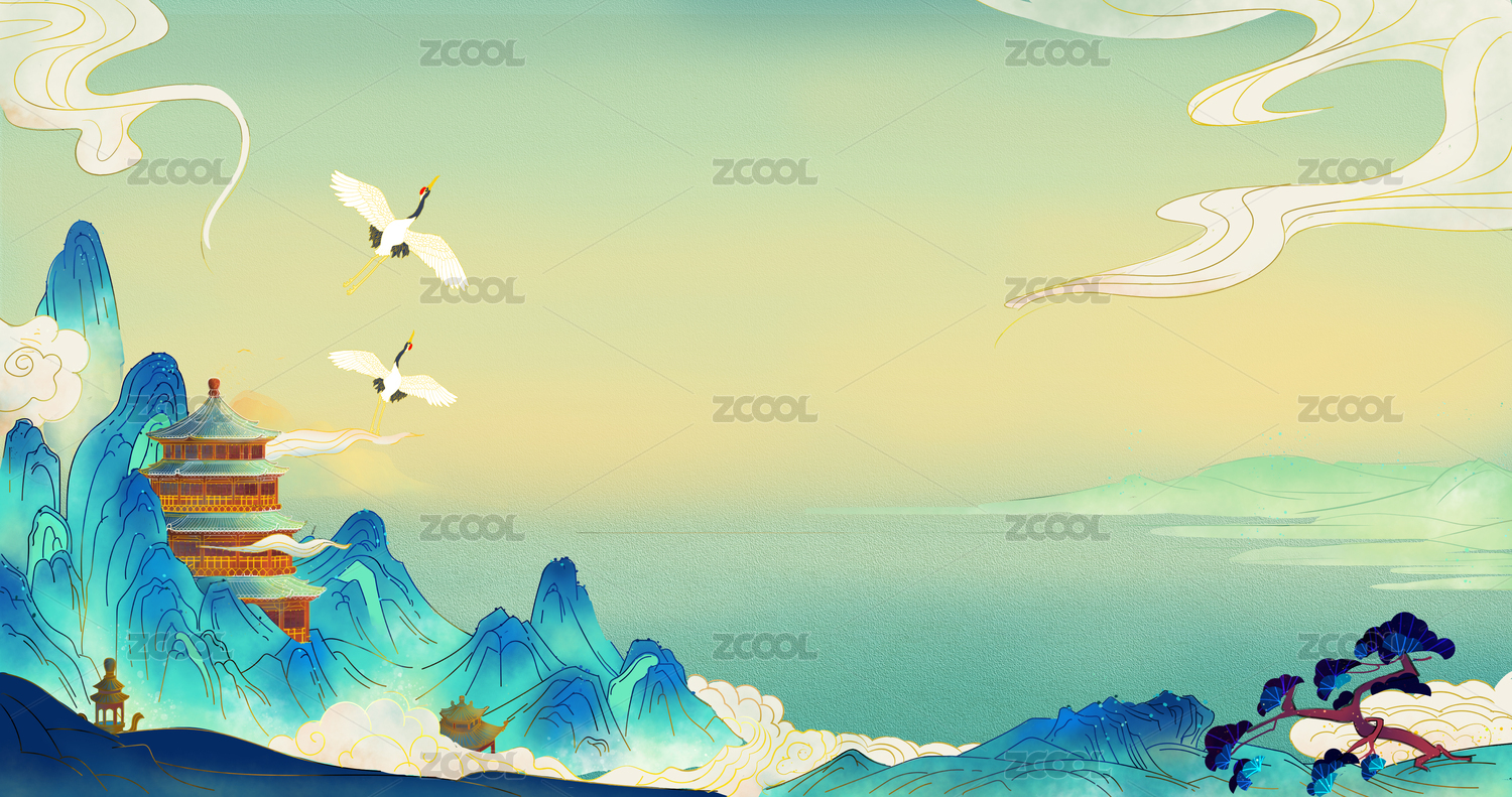 中國風(fēng)山水云紋與仙鶴