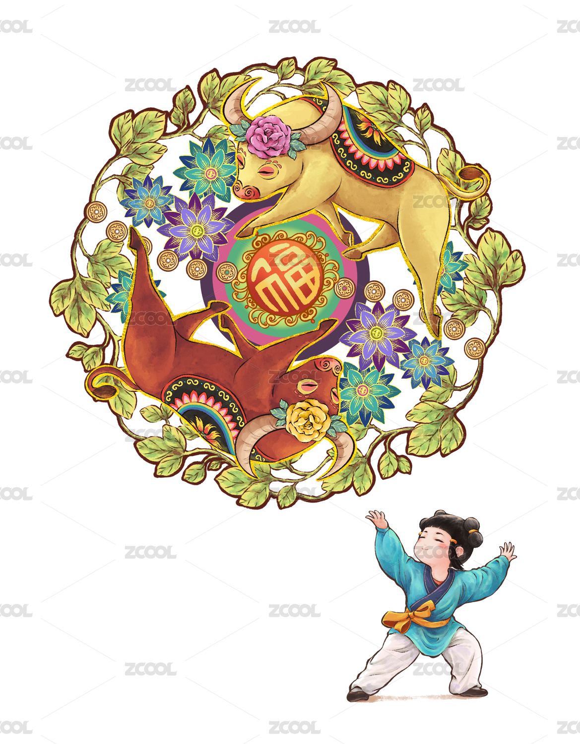 2021牛年春節(jié)牛氣沖天扭轉(zhuǎn)乾坤剪紙插畫