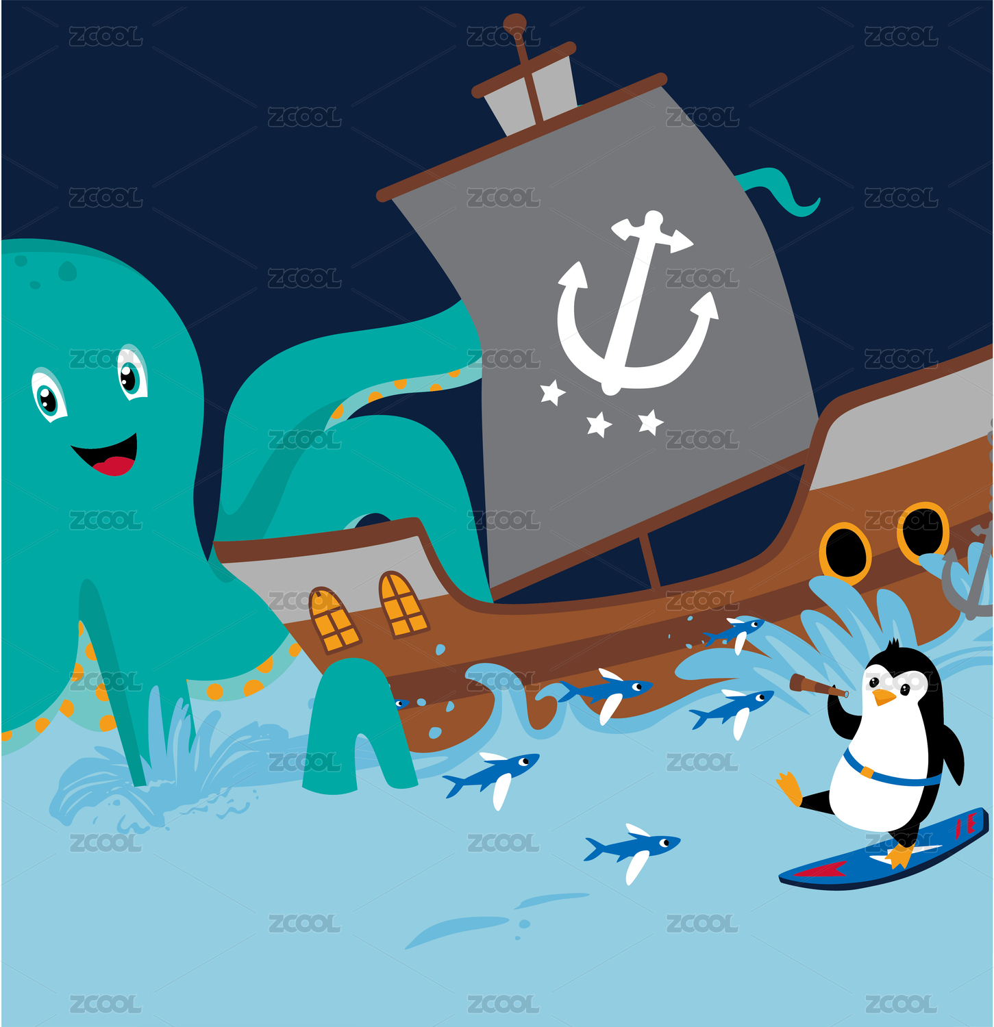 可愛風(fēng)格海盜船上的海盜手拿著刀指揮插畫元素