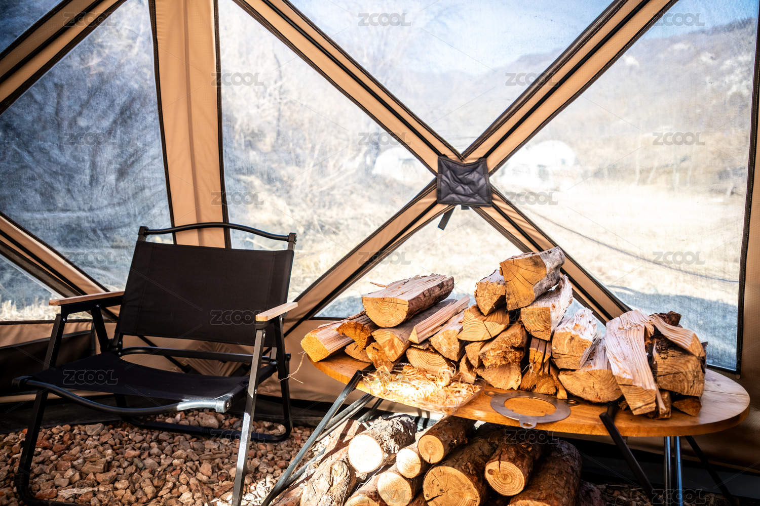 露營帳篷中的折疊椅和取暖的木柴