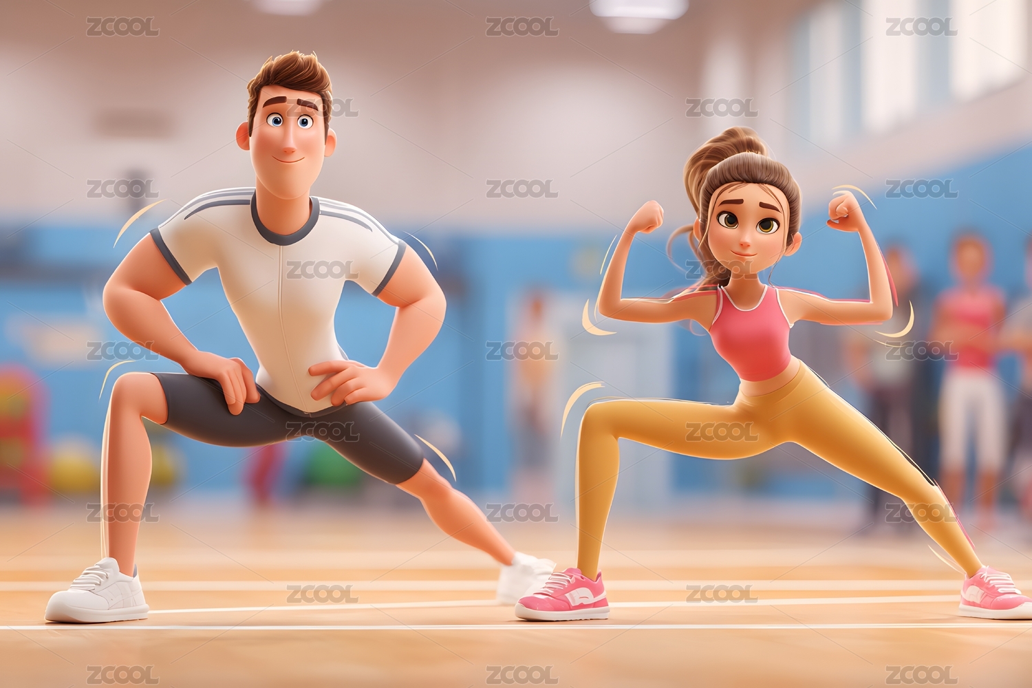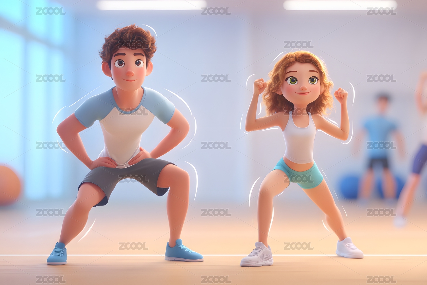 明亮室內(nèi)卡通男孩女孩健身運(yùn)動插畫素材