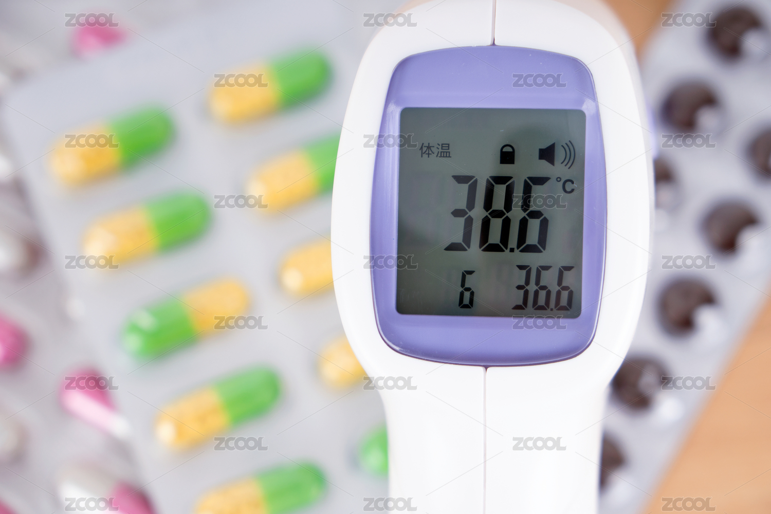 測溫槍上的38.6攝氏度特寫和各種藥品背景