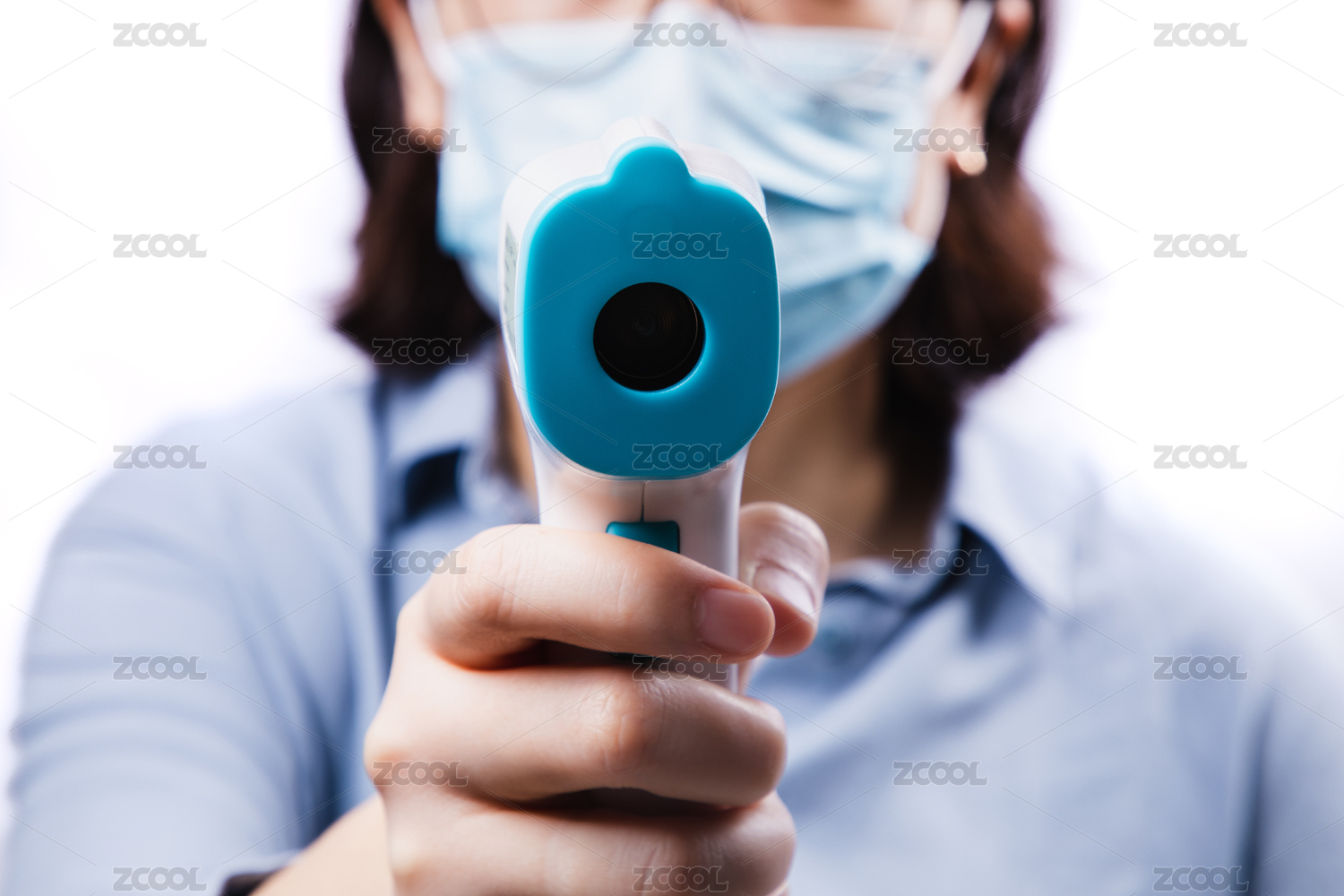 白色背景特寫白領(lǐng)女性拿著電子測溫槍