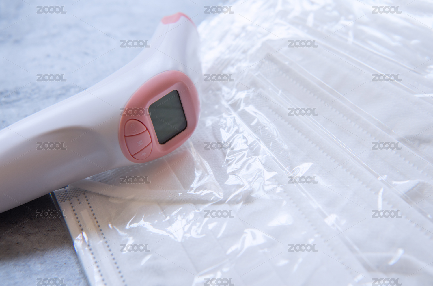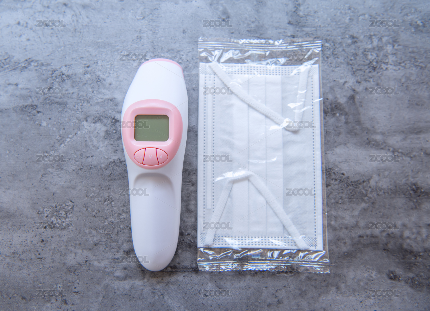 特寫小人偶測溫槍記錄表格酒精和口罩