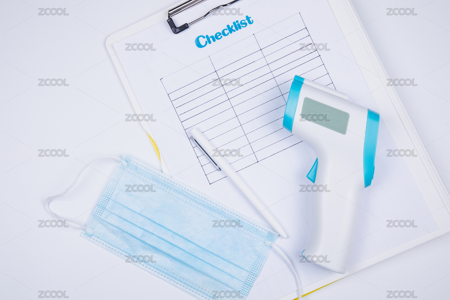白色背景特寫記錄本子,筆口罩和測溫槍